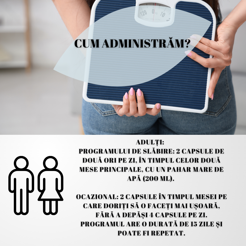 Mod de utilizare adulți: În cadrul programului de slăbire: 2 capsule de două ori pe zi, în timpul celor două mese principale, cu un pahar mare de apă (200 ml).