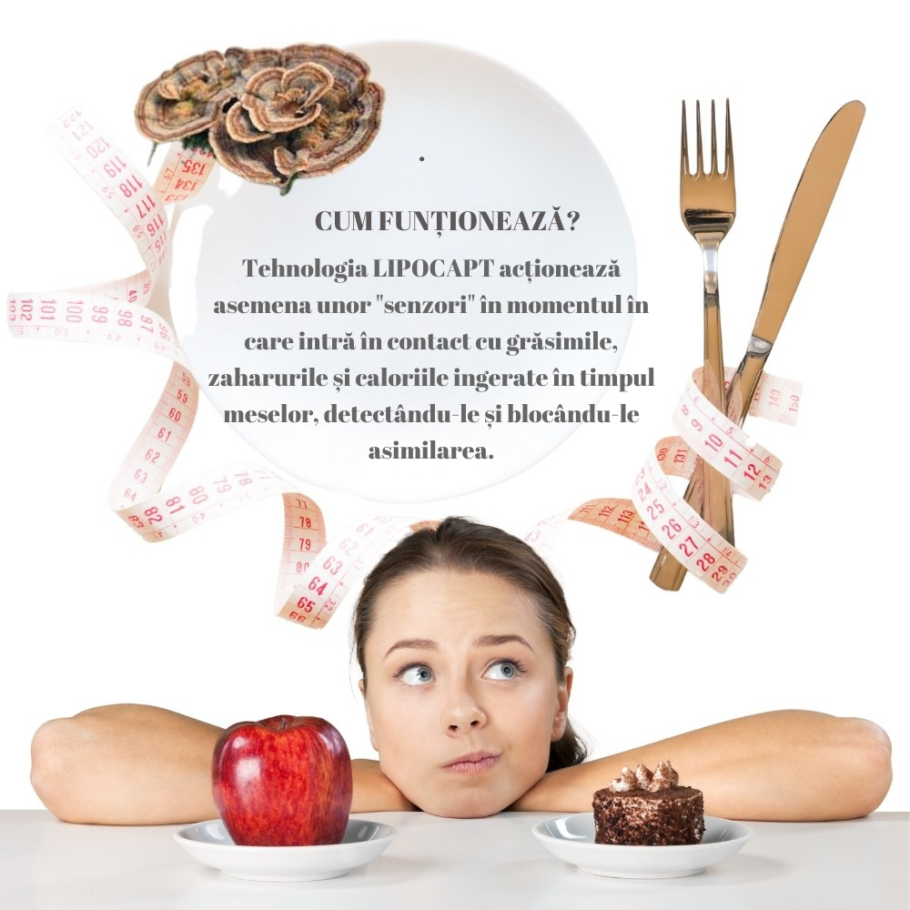 Captarea unei părți din grăsimile din alimente¹ datorită ingredientului LipoCapt, un compus din polizaharide provenite din ciuperci. Fibrele sale naturale contribuie la captarea unei părți din grăsimile ingerate și la eliminarea lor pe cale naturală.