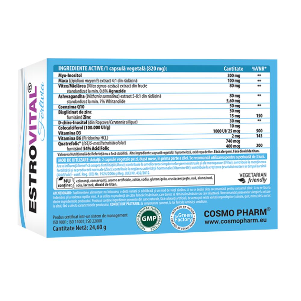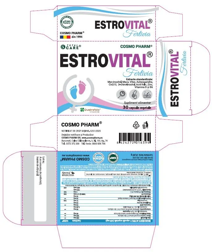 Estrovital Fertivia are o influență benefică asupra fertilității (Vitex contribuie la ameliorarea simptomelor premenstruale și ale menopauzei (Vitex) contribuie la menținerea fertilității și reproducerii normale (Zinc), contribuie la reglarea activității hormonale (Vitamina B6), contribuie la creșterea țesutului matern în timpul sarcinii (Acid folic)