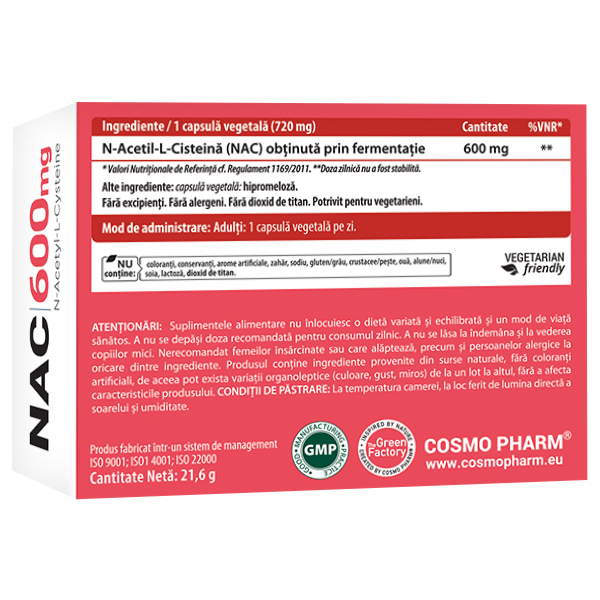 NAC (N-Acetilcisteina) de la COSMO PHARM® este un supliment avansat care contribuie la cresterea nivelului de glutation, principalul antioxidant intracelular al organismului.