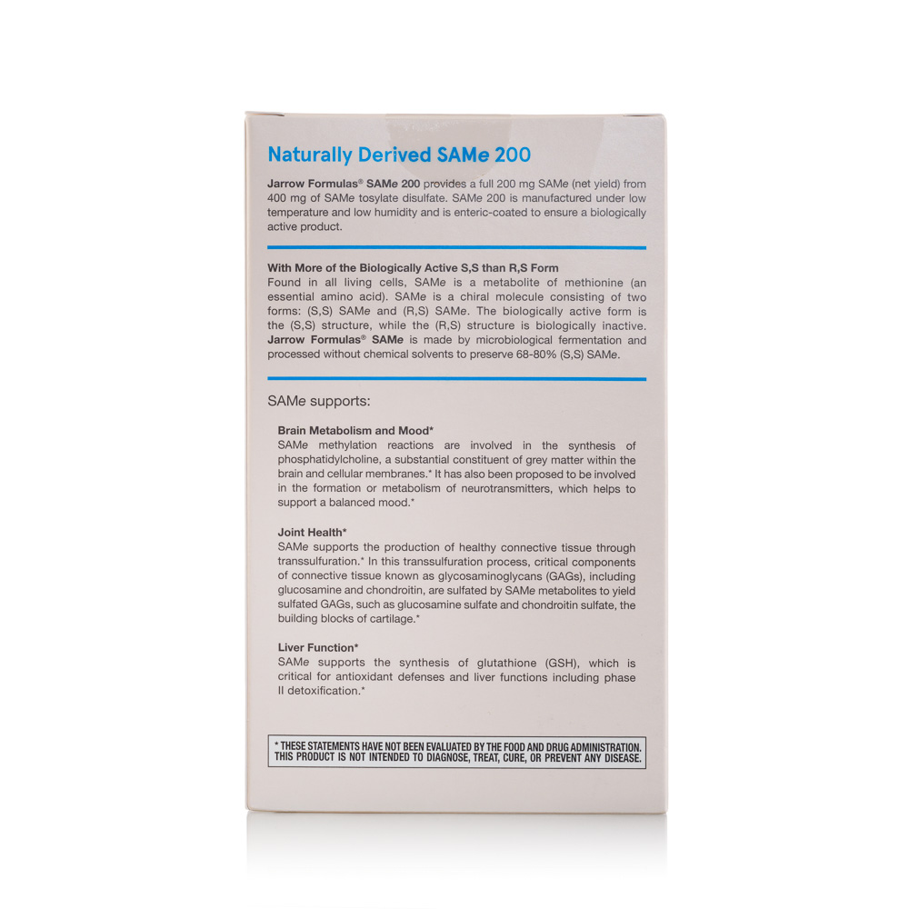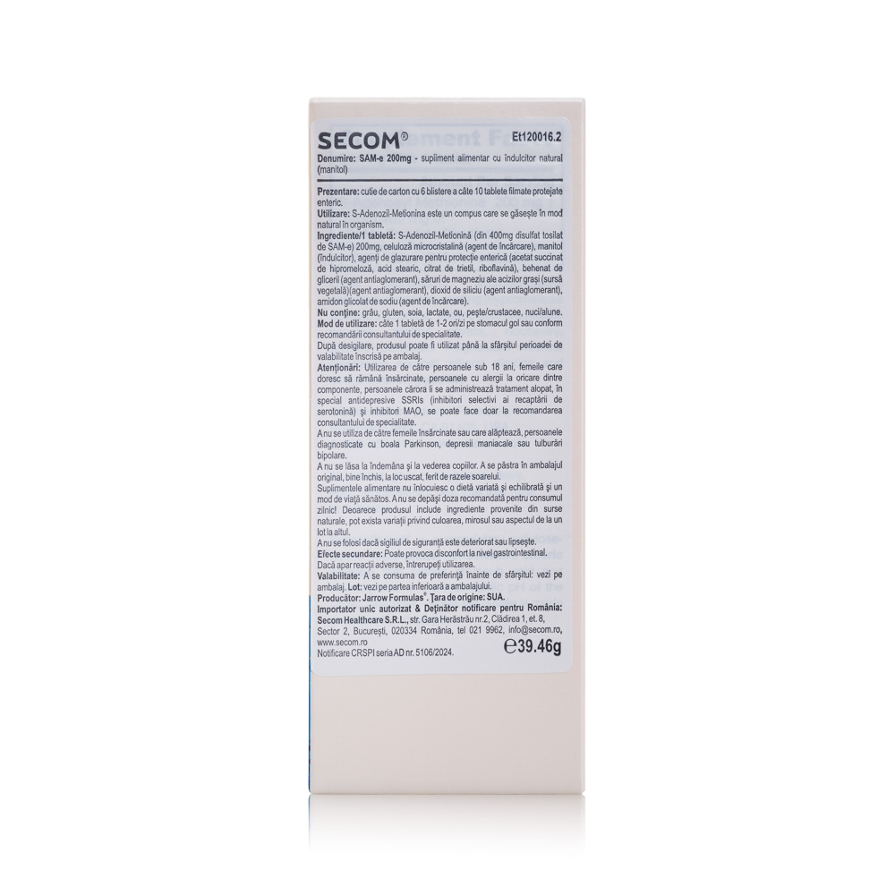 Ingrediente/1 tabletă: S-Adenozil-Metionină (din 400mg disulfat tosilat de SAM-e) 200mg, celuloză microcristalină (agent de încărcare), manitol (îndulcitor), agenți de glazurare pentru protecție enterică (acetat succinat de hipromeloză, acid stearic, citrat de trietil, riboflavină), behenat de gliceril (agent antiaglomerant), săruri de magneziu ale acizilor graşi (sursă vegetală)(agent antiaglomerant), dioxid de siliciu (agent antiaglomerant), amidon glicolat de sodiu (agent de încărcare).