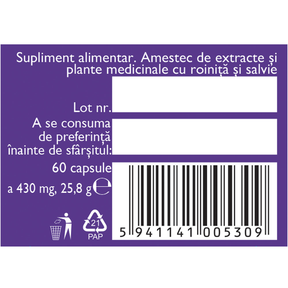 Supliment alimentar pe bază de plante atent selecționate – roiniță, talpa gâștii, salvie și lavandă – formulate pentru a sprijini echilibrul și starea generală de bine.