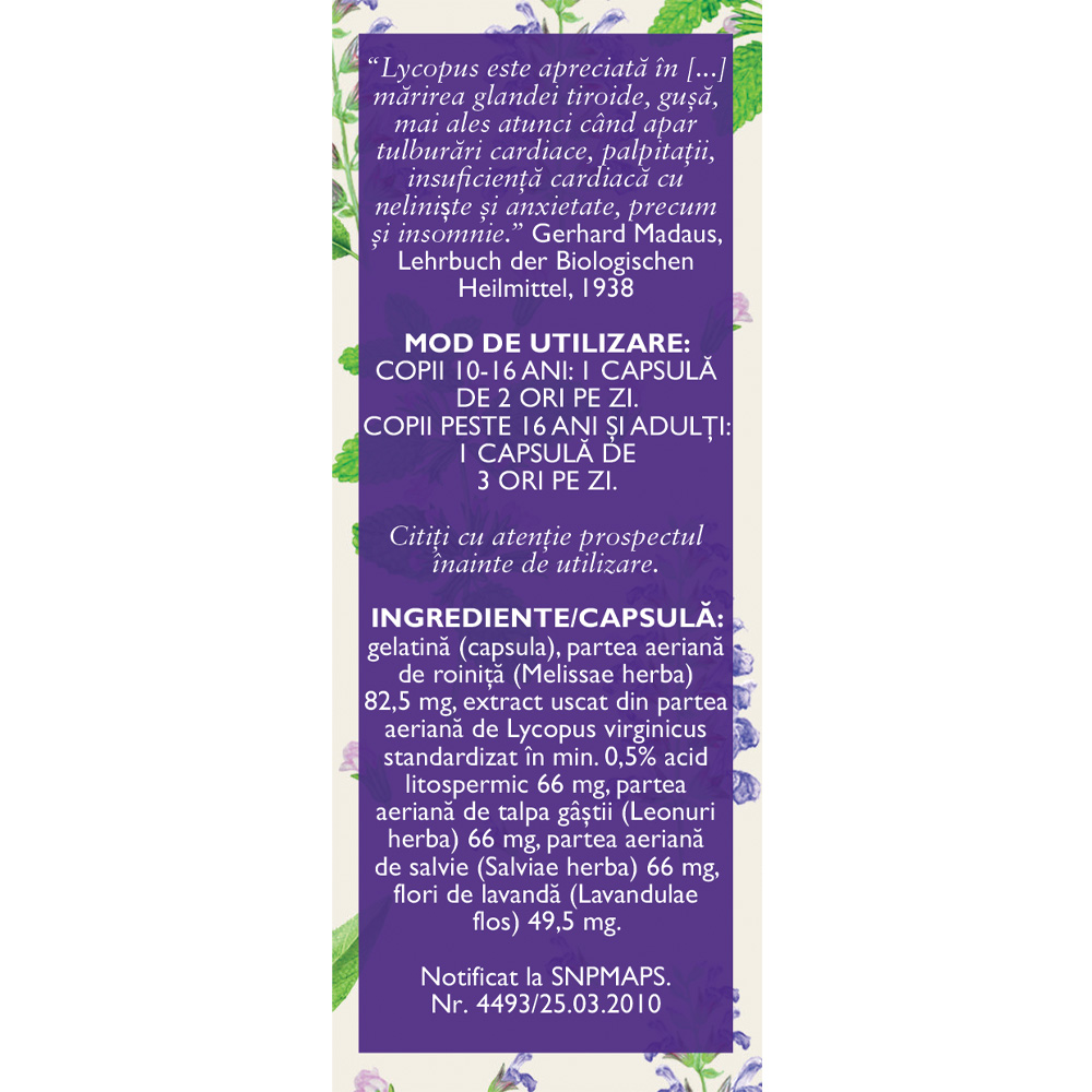 gelatină (capsula), partea aeriană de roiniță (melissae herba) 82,5 mg, extract uscat din partea aeriană de lycopus virginicus standardizat în min. 0,5% acid litospemic 66 mg, partea aeriană de talpa gâștii (leonuri herba) 66 mg, partea aeriană de salvie (salviae herba) 66 mg, flori de lavandă (lavandulae flos) 49,5 mg