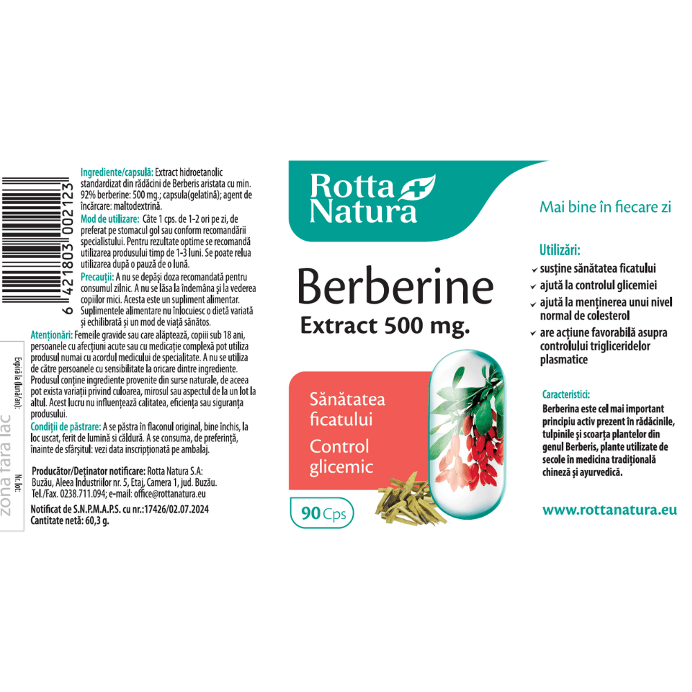 per capsula: Extract hidroetanolic standardizat din rădăcini de Berberis aristata cu min. 92% berberină: 500 mg; capsulă (gelatină); agent de încărcare: maltodextrină.