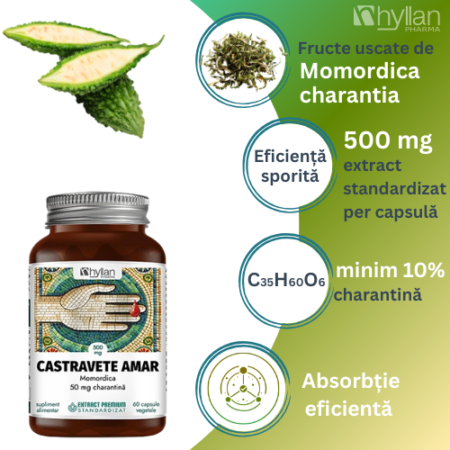 Formulă 100% naturală, fără conservanți, coloranți acest supliment alimentar conține extract din fructe de Momordica charantia (Castravete amar), o plantă recunoscută în fitoterapia tradițională pentru proprietățile sale hipoglicemiante.