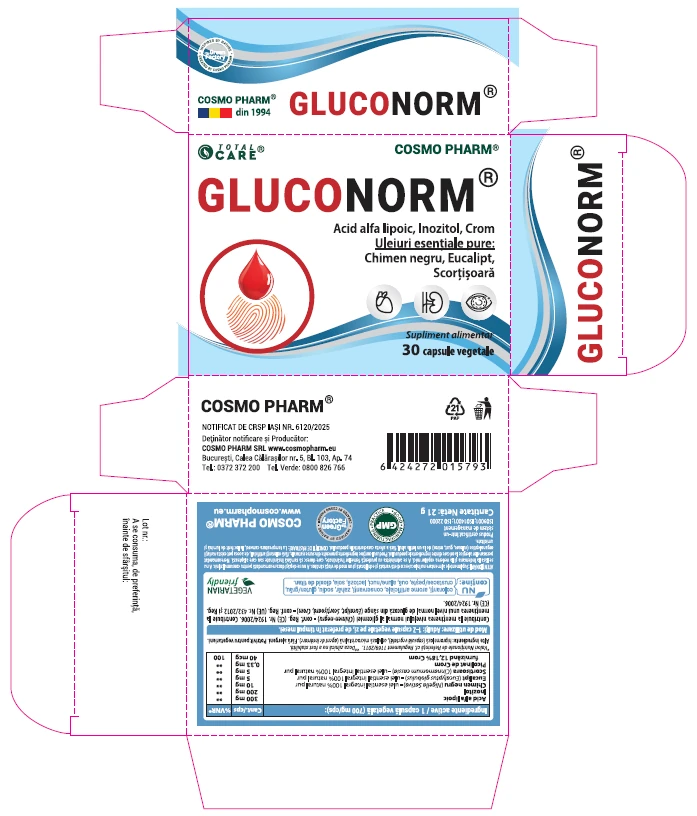 GLUCONORM – Cosmo Pharm® este un supliment alimentar pe bază de extracte vegetale și nutrienți esențiali, creat pentru susținerea metabolismului normal al glucozei. Formula combină chimen-negru, eucalipt, scorțișoară, crom și acid alfa lipoic, ingrediente care contribuie la menținerea echilibrului energetic și a unui nivel normal al zahărului din sânge.