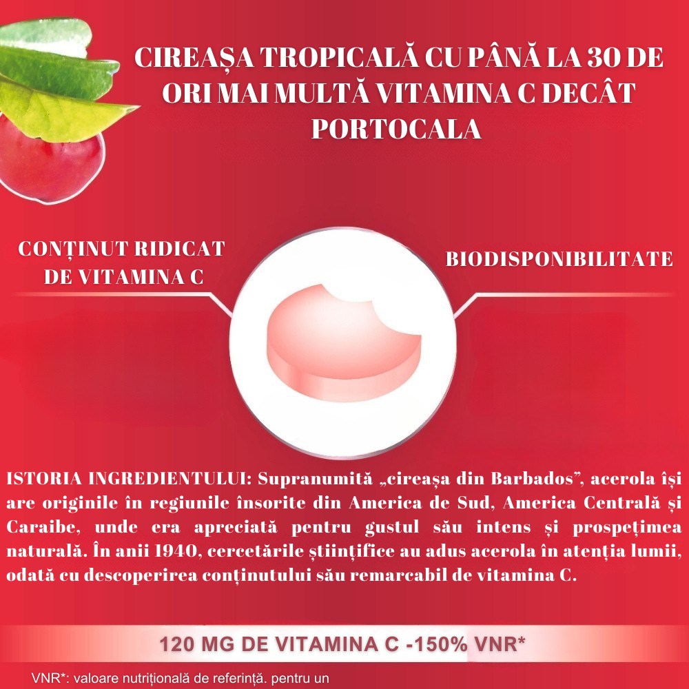 Această mică cireașă roșie crește spontan în regiunile tropicale din America de Sud și conține de 20 până la 30 de ori mai multă vitamina C decât o portocală! Cu aromă de fructe roșii, o tabletă îți oferă 120 mg de vitamina C, adică 150% din doza zilnică recomandată.