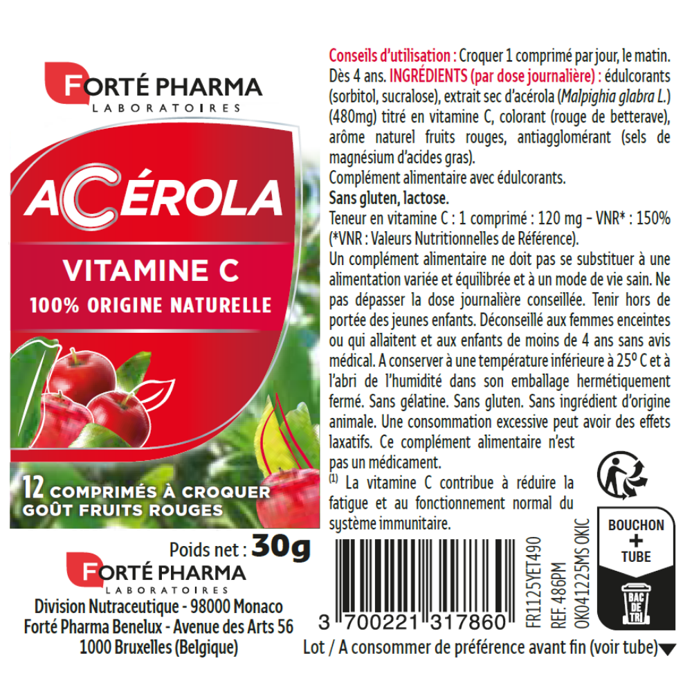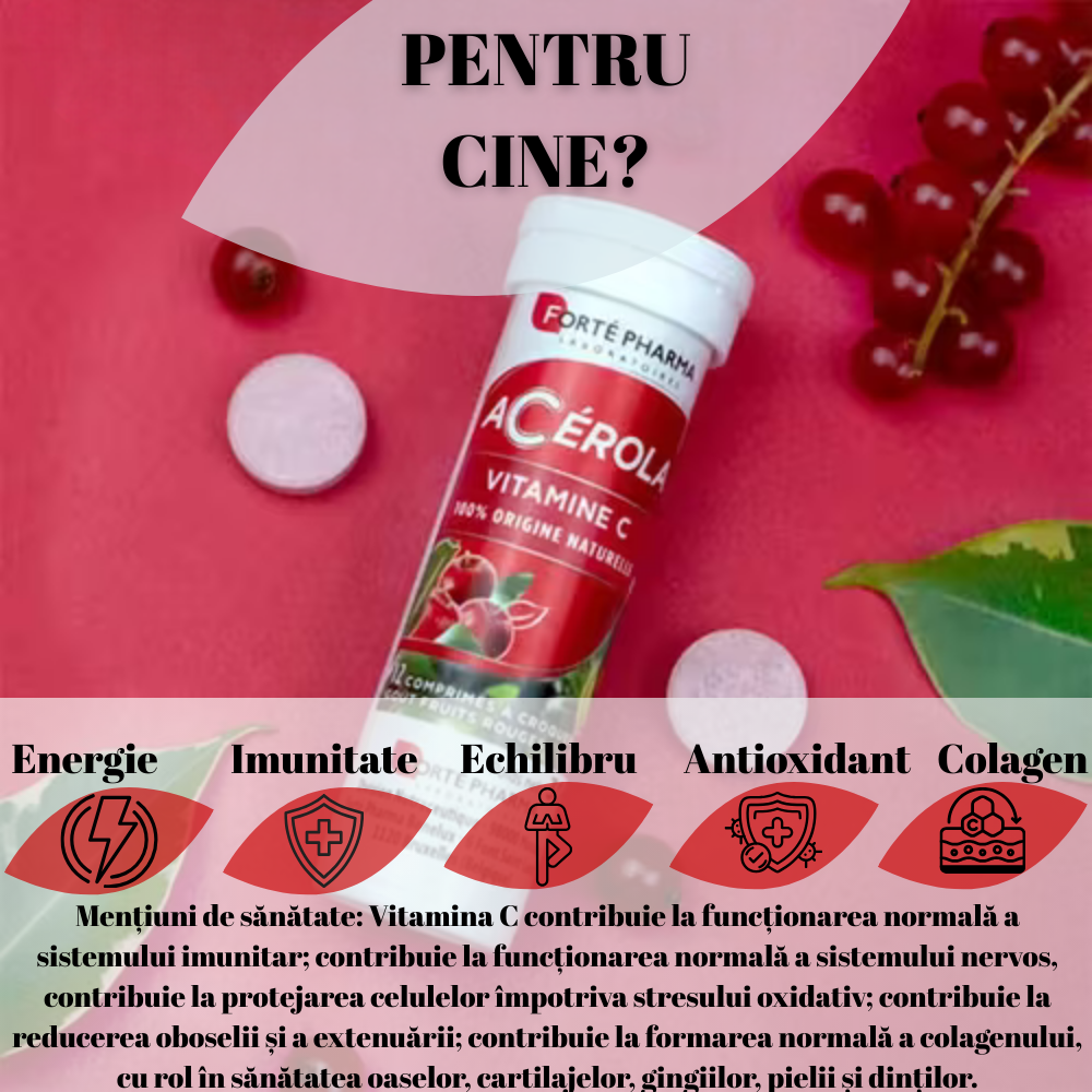 Acerola Forte Pharma te ajută să depășești micile momente de oboseală care pot apărea în viața de zi cu zi, oferindu-ți tonus și vitalitate1 pe tot parcursul zilei. Acerola1 este unul dintre cele mai bogate fructe în vitamina C.