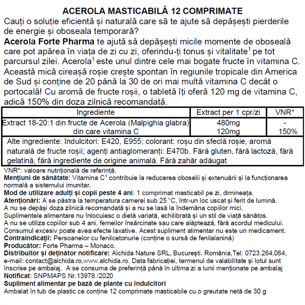 | Extract 18-20:1 din fructe de Acerola (Malpighia glabra), din care vitamina C | 480 mg 120 mg |