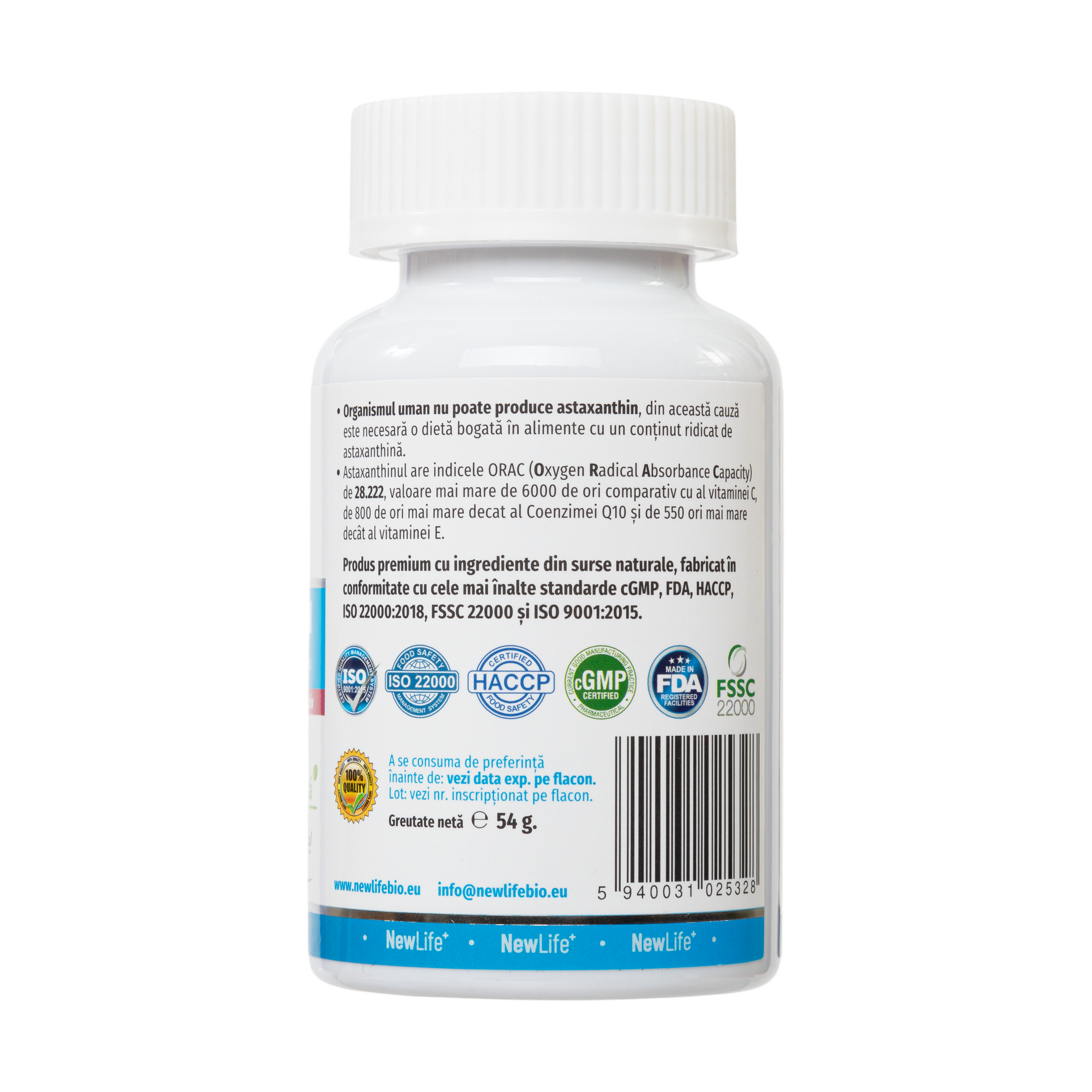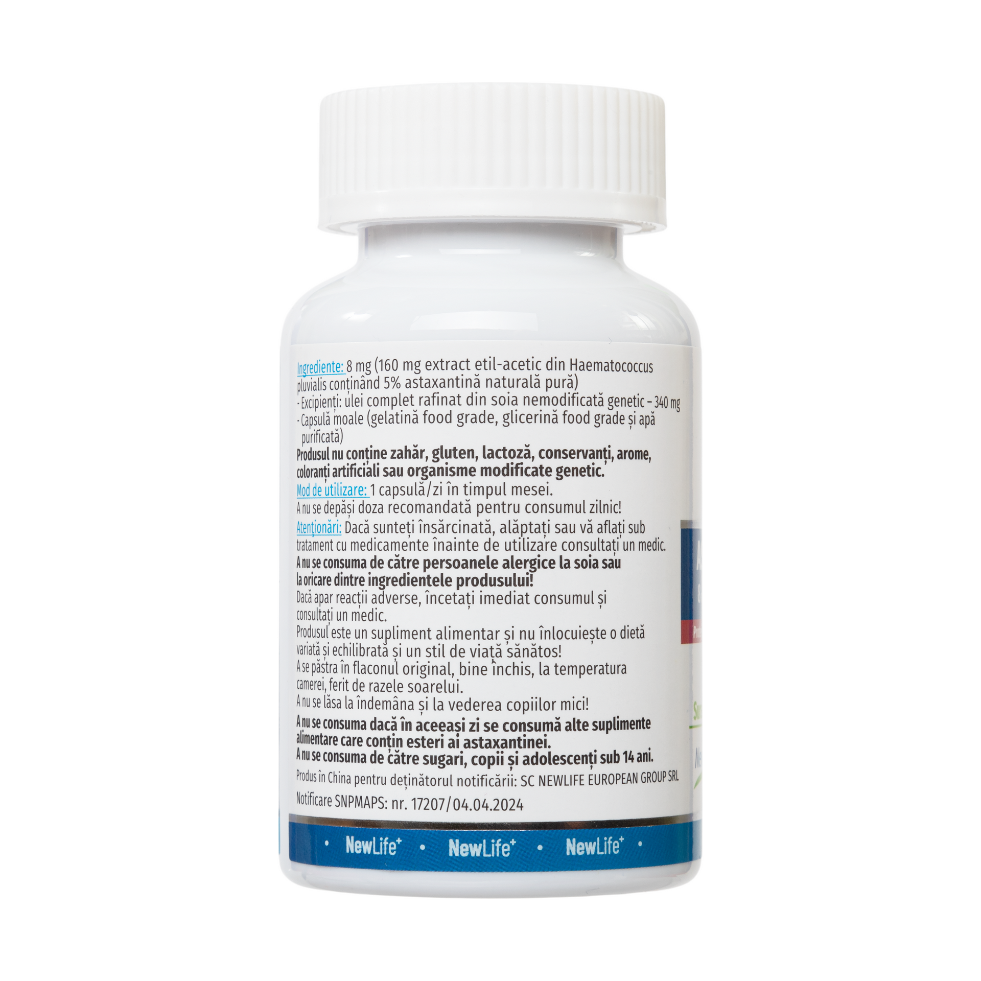 Supliment alimentar cu astaxantină naturală, obținută din Haematococcus pluvialis. Produsul conține 8 mg astaxantină per capsulă și este prezentat sub formă de capsule moi.