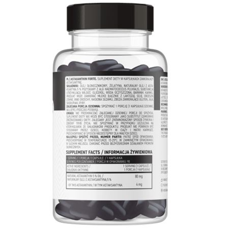 OstroVit Astaxanthin Forte este un supliment alimentar de înaltă calitate care conÈ›ine extract natural de astaxantină, obÈ›inut din alge Haematococcus pluvialis. Produsul furnizează 80 mg ulei natural de astaxantină per porÈ›ie, echivalentul a 4 mg astaxantină pură, sub formă de capsule softgel uÈ™or de administrat.