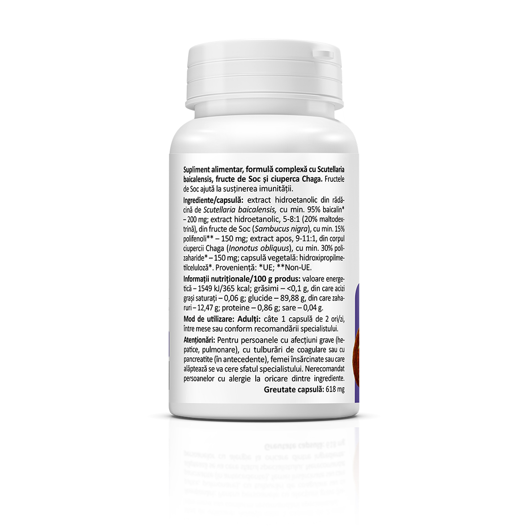 Supliment alimentar, formulă complexă cu Scutellaria baicalensis, fructe de Soc și ciuperca Chaga. Fructele de Soc ajută la susținerea imunității.