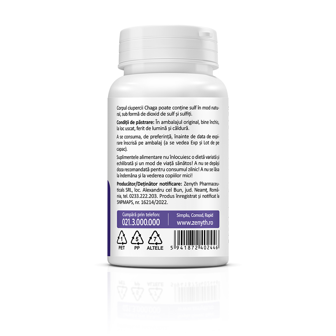 extract apos, 9-11:1, din corpul ciupercii Chaga (Inonotus obliquus), cu min. 30% polizaharide – 150 mg