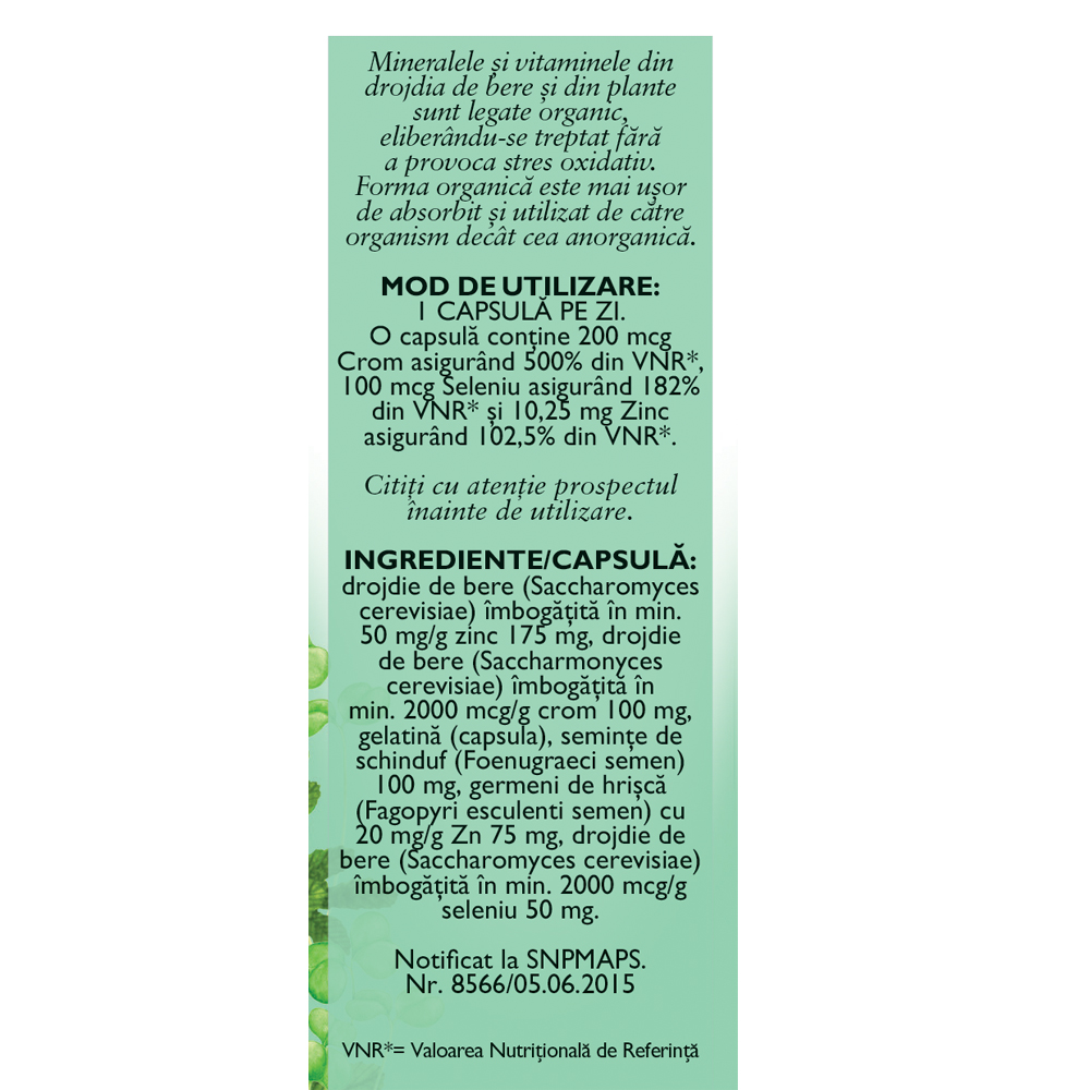 Ddrojdie de bere (Saccharomyces cerevisiae) imbogatita in min. 50 mg/g zinc 175 mg, drojdie de bere (Saccharomyces cerevisiae) imbogatita in min. 2000 mcg/g crom 100 mg, seminte de schinduf (Foenugraeci semen) 100 mg, germeni de hrisca (Fagopyri esculenti semen) cu 20 mg/g zinc 75 mg, drojdie de bere (Saccharomyces cerevisiae) imbogatita in min. 2000 mcg/g seleniu 50 mg.