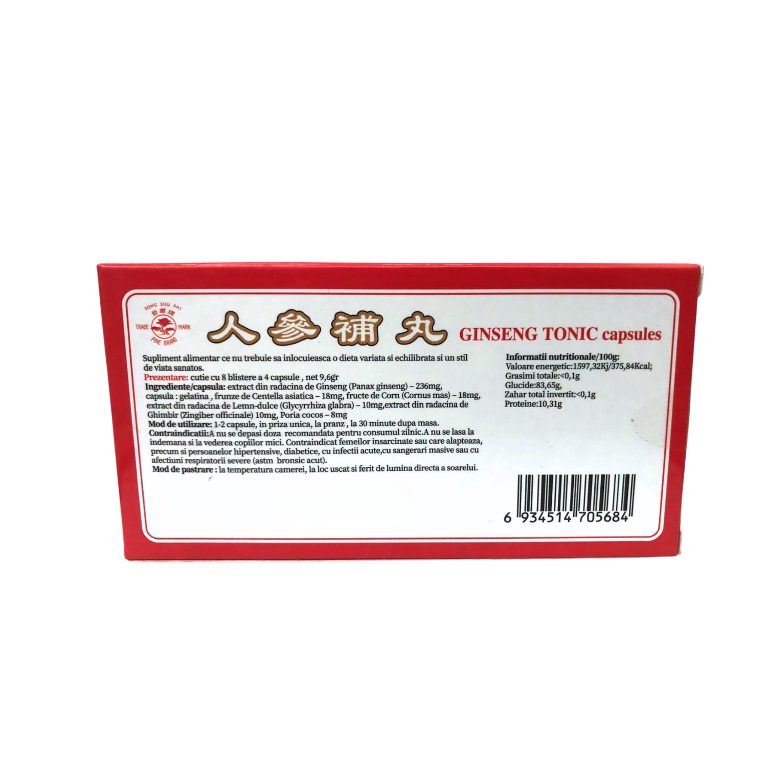 Extract din radacina de Ginseng (Panax ginseng) – 236mg, capsula : gelatina , frunze de Centella asiatica – 18mg, fructe de Corn (Cornus mas) – 18mg, extract din radacina de Lemn-dulce (Glycyrrhiza glabra) – 10mg,extract din radacina de Ghimbir (Zingiber officinale) 10mg, Poria cocos – 8mg.