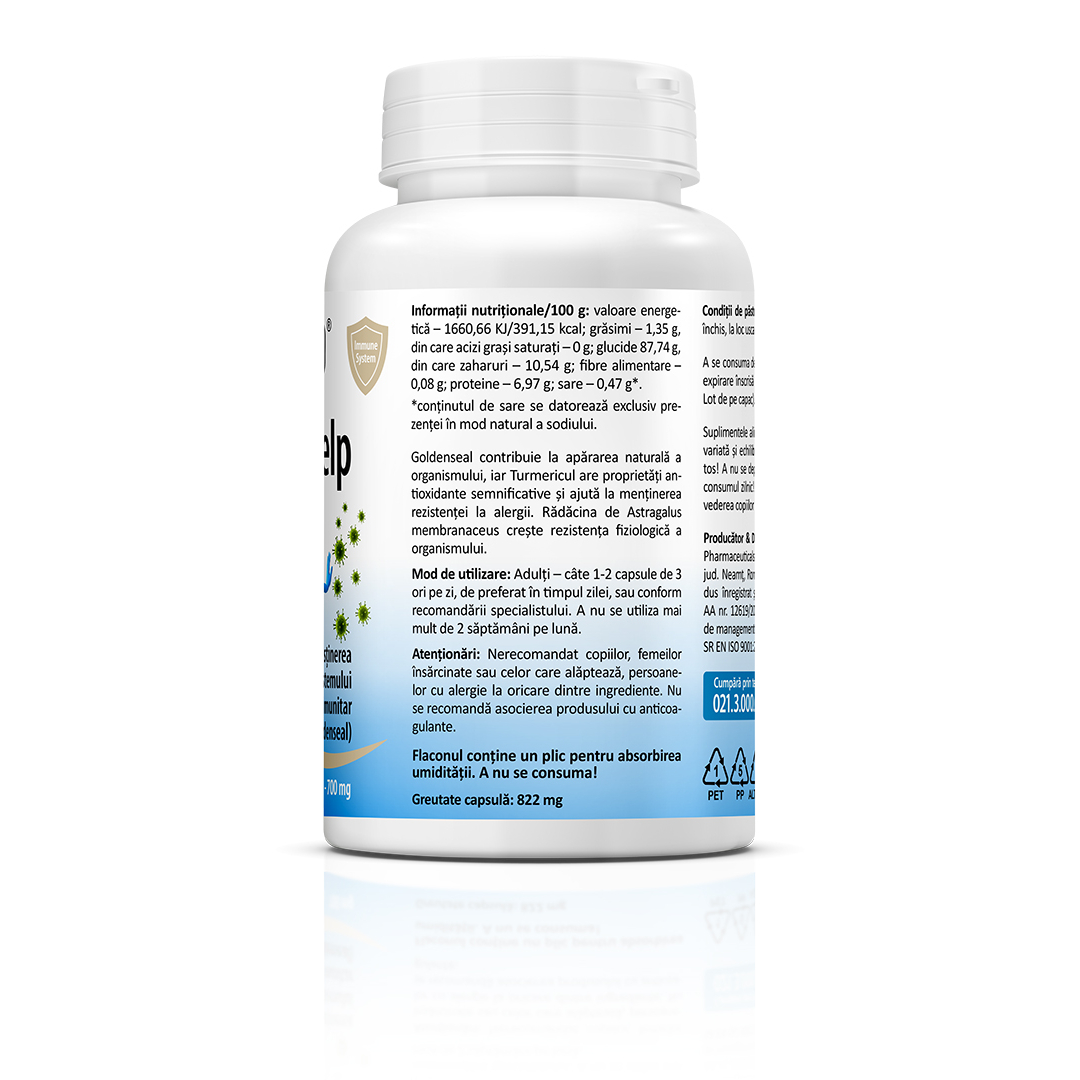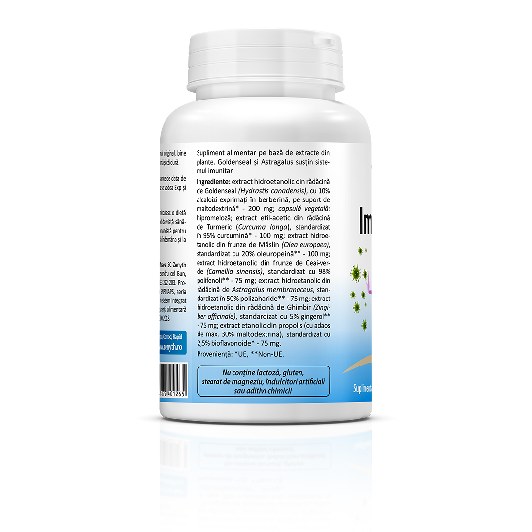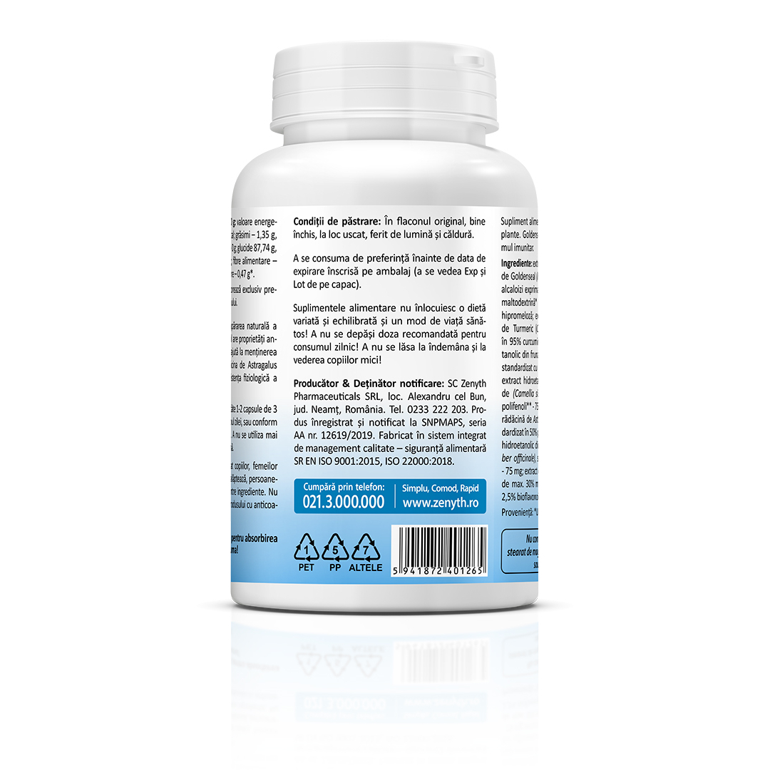 Supliment alimentar pe bază de extracte din plante (Goldenseal, Astragalus, turmeric, ceai verde, măslin, ghimbir și propolis).