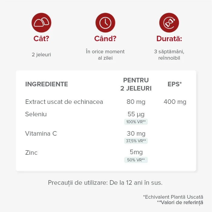 agent de încărcare: maltitol - extract de rădăcină de echinacea (echinacea angustifolia) - agent de gelifiere: pectină - acidifiant: acid citric - ascorbat de sodiu (vitamina c) - aromă naturală - citrat de zinc - acid ascorbic (vitamina c) - acidifiant: citrate de sodiu selenitul de sodiu - concentrat (carrot daucus carota și cassis ribes nigrum l.) - agent de acoperire: ceară de carnauba.