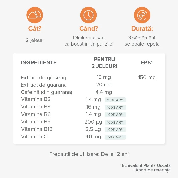 Adulți și copii peste 12 ani: 2 jeleuri/zi, dimineața sau pentru un impuls de energie în timpul zilei.