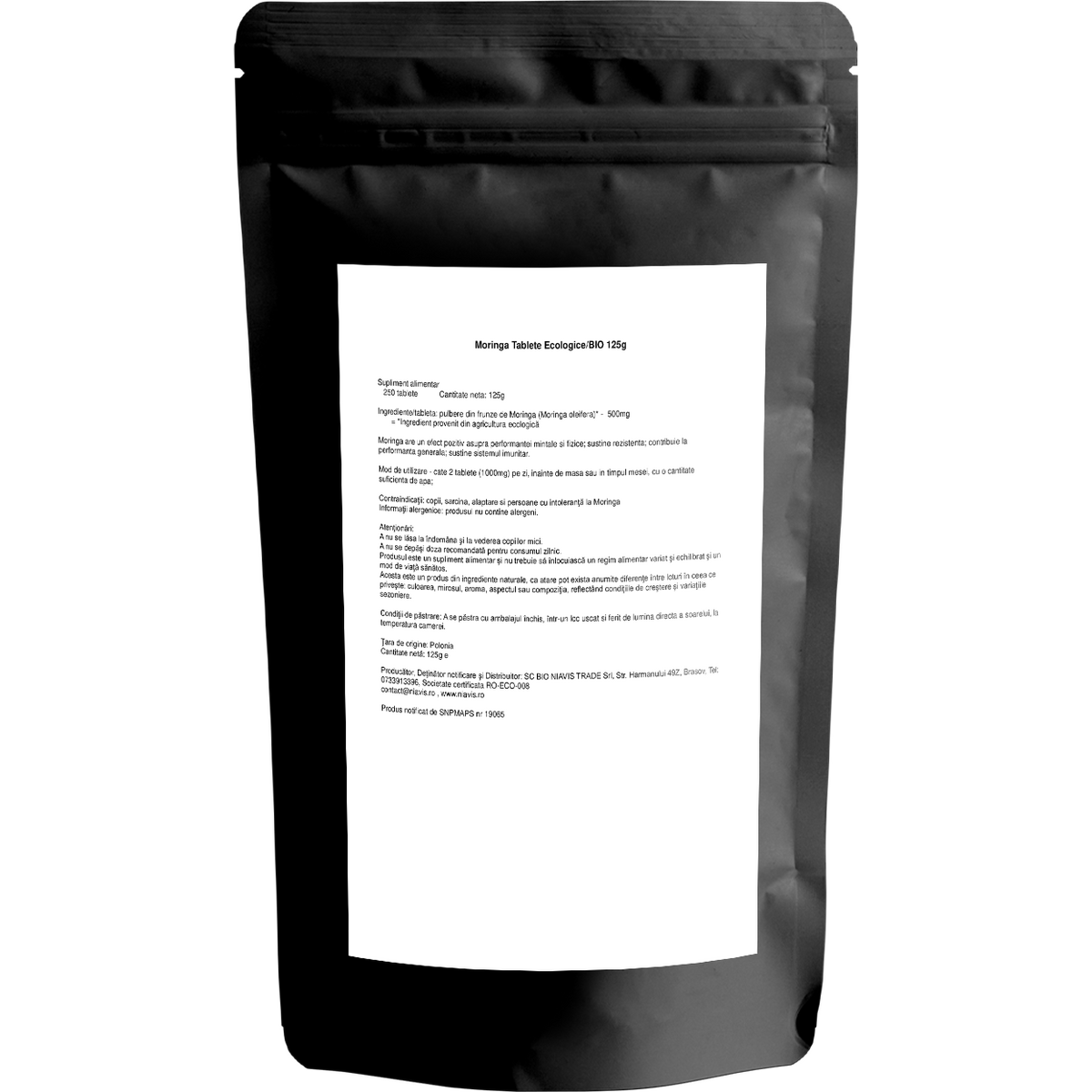 Supliment alimentar pe bază de pulbere ecologică din frunze de moringa, sub formă de tablete, pentru completarea dietei zilnice.