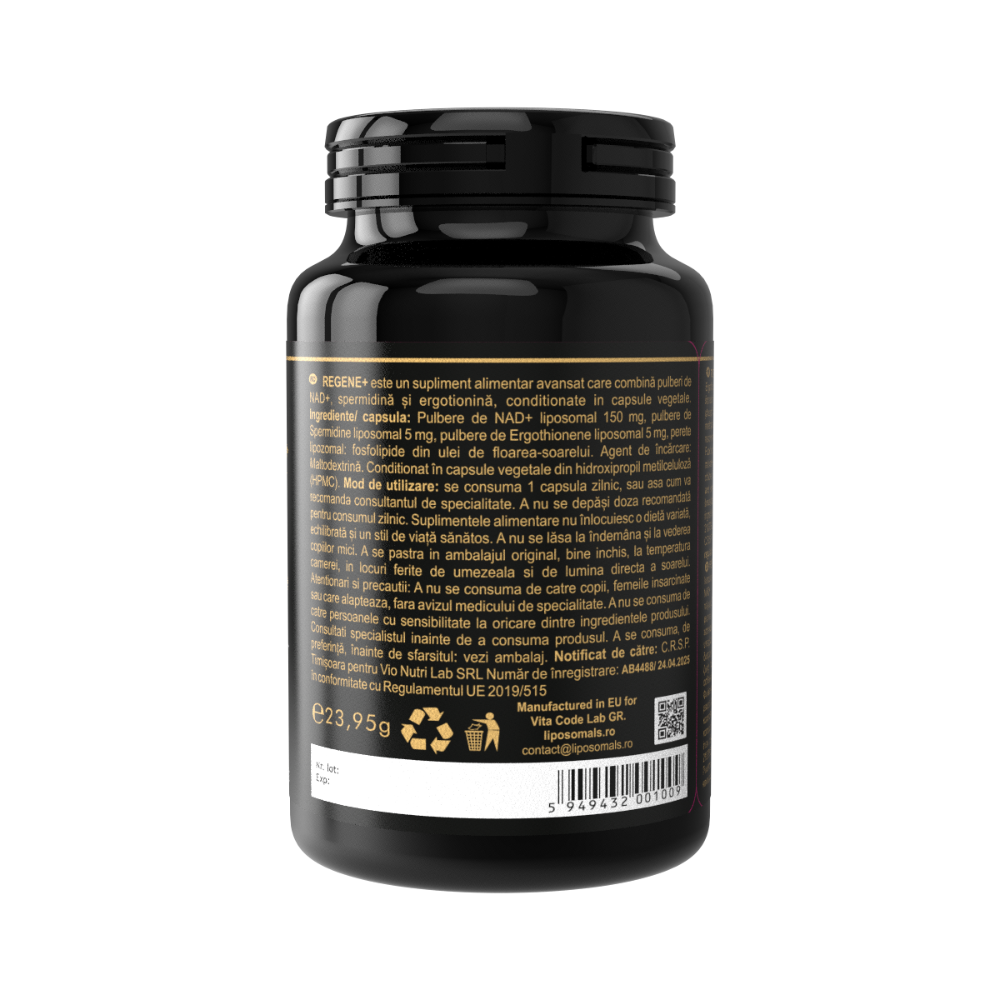 Regene+ combina trei ingrediente cheie pentru longevitate si regenerare: NAD+, spermidina si ergotionina – toate in forma lipozomala pentru absorbtie ridicata.