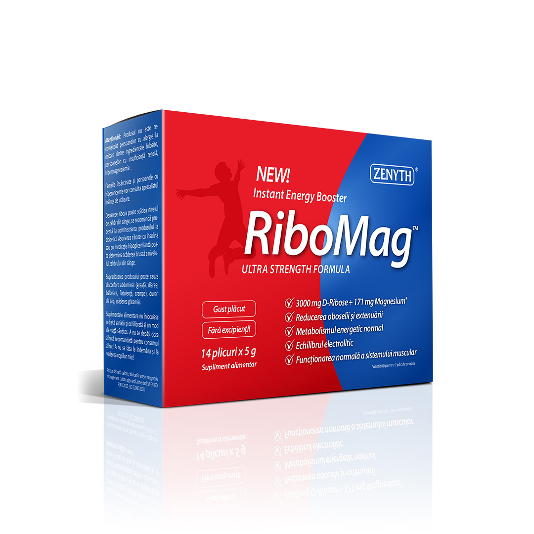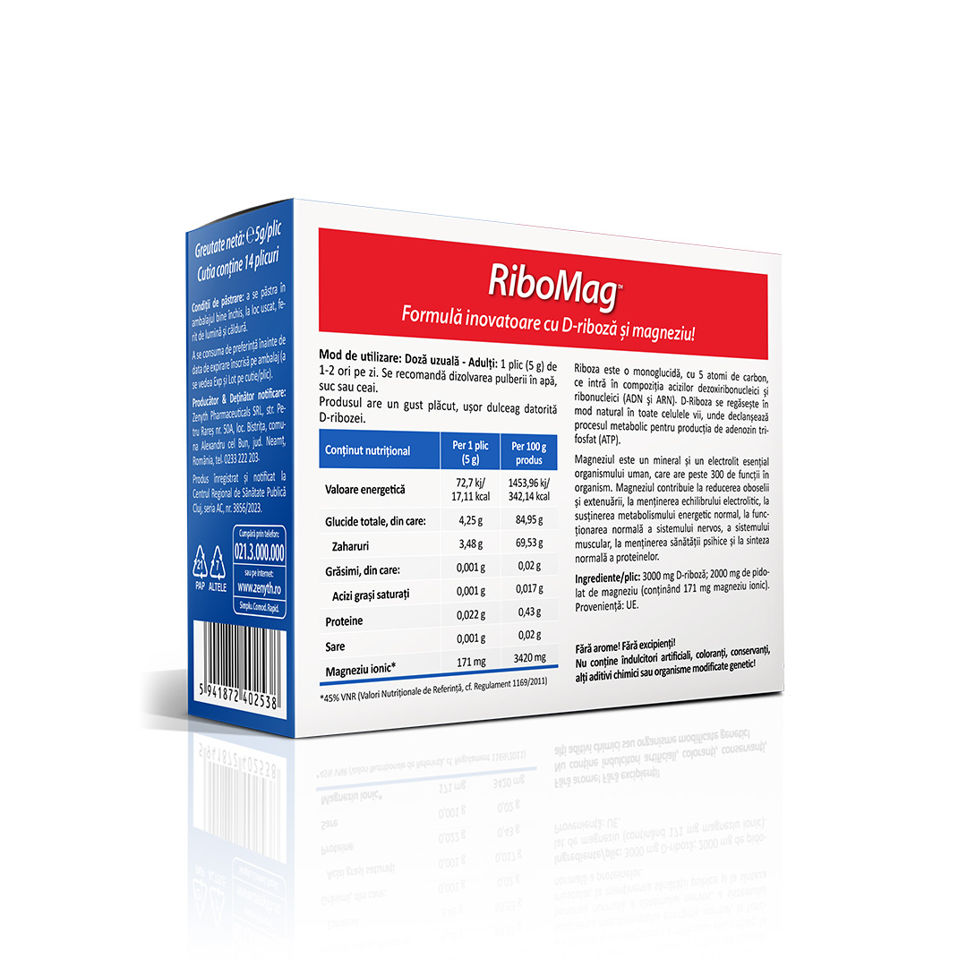 Supliment alimentar cu D-riboza si magneziu, sub forma de pulbere, destinat completarii aportului zilnic de nutrienti in cadrul unei alimentatii echilibrate.