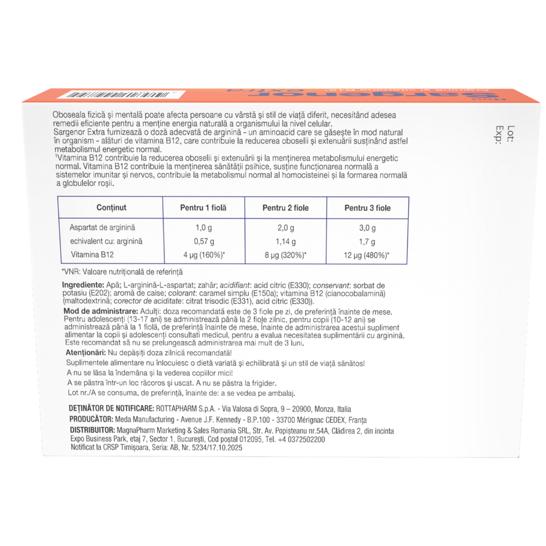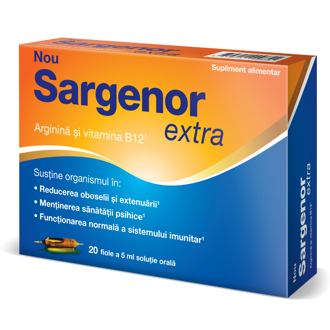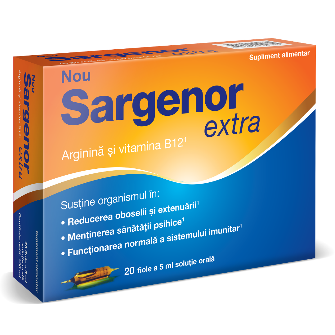 Sargenor Extra furnizează o doză adecvată de arginină – un aminoacid care se găsește în mod natural în organism – alături de vitamina B12, care contribuie la reducerea oboselii și extenuării susținând astfel metabolismul energetic normal.