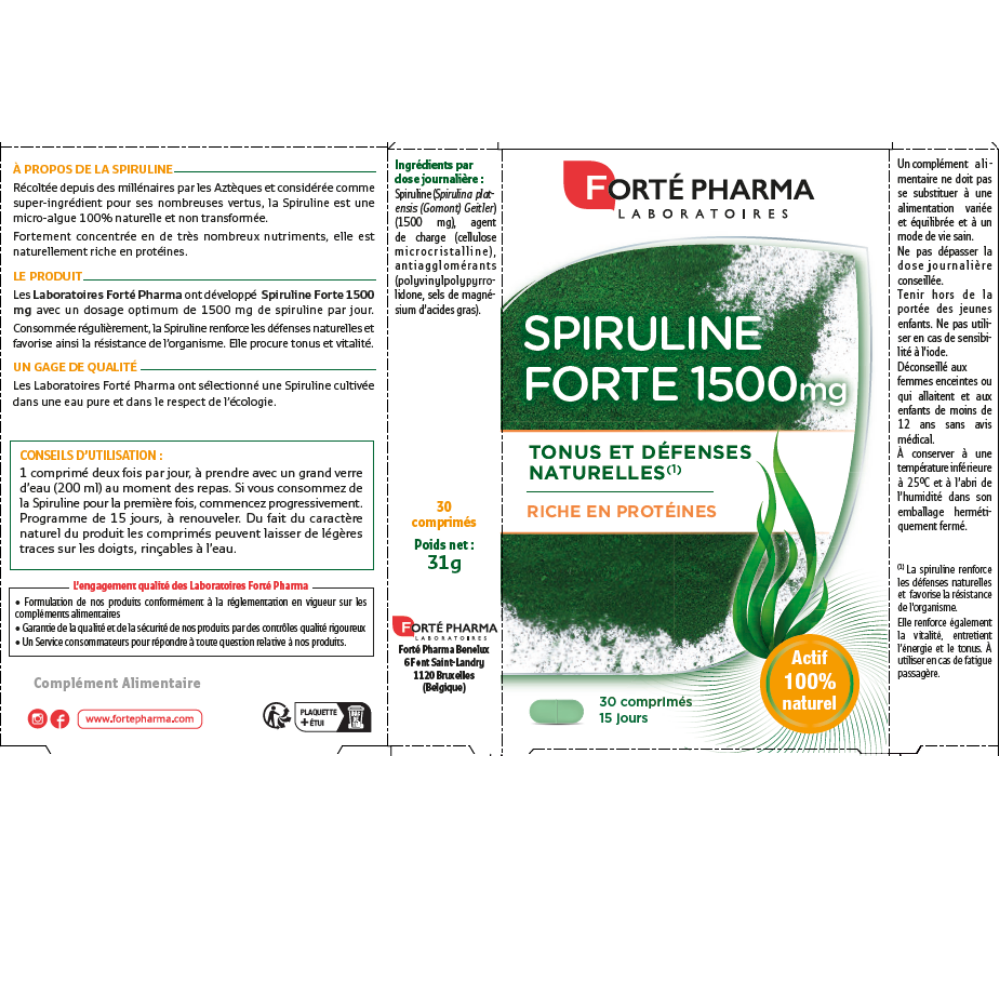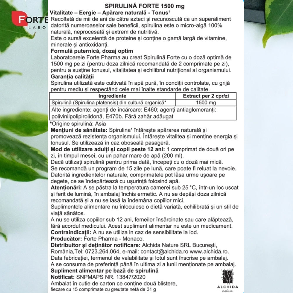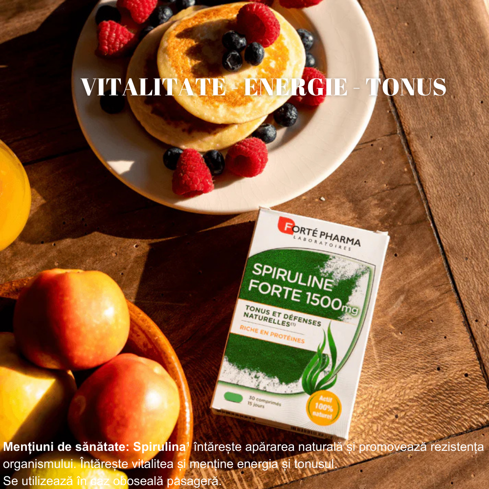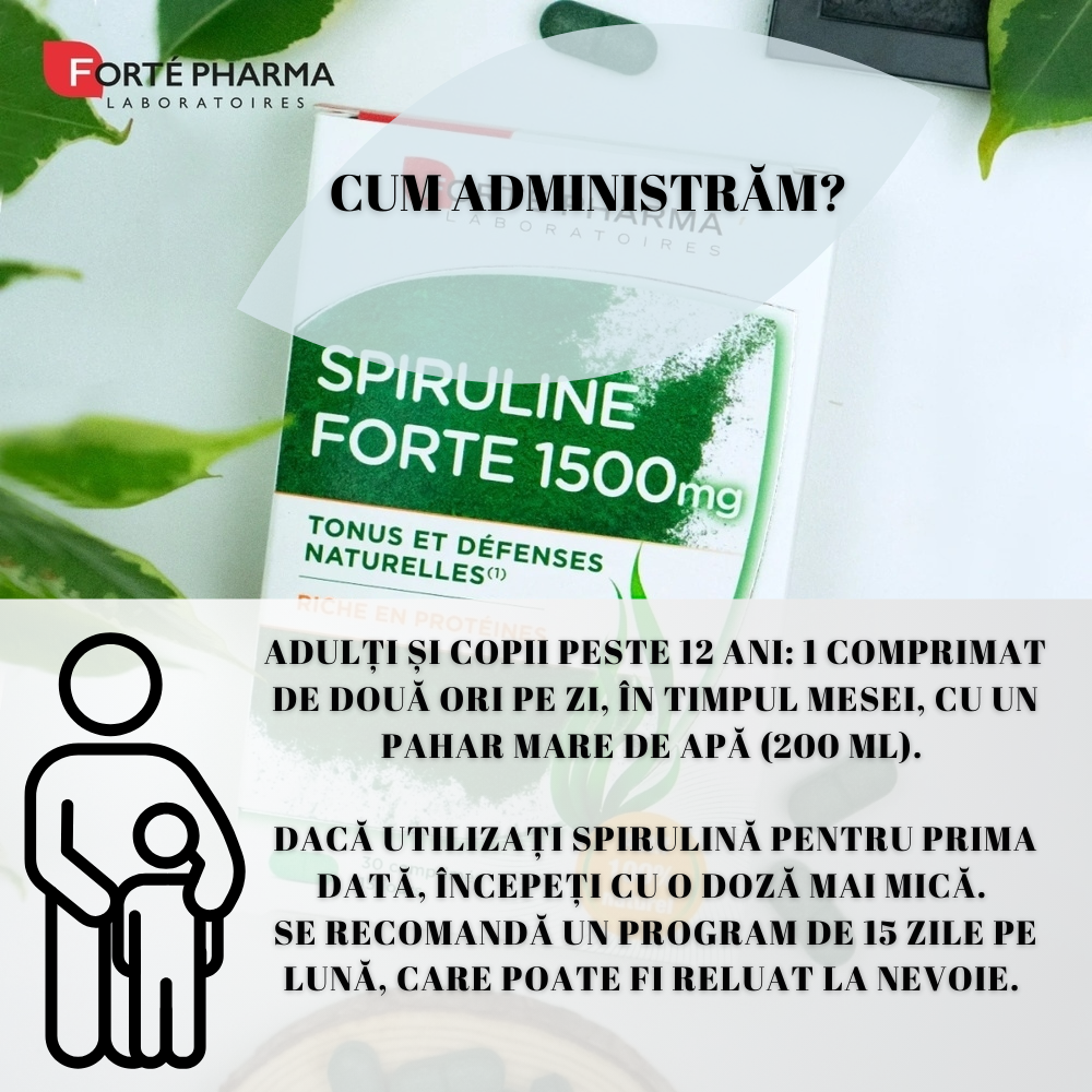Laboratoarele Forte Pharma au creat Spirulină Forte cu o doză optimă de 1500 mg pe zi (pentru doza zilnică recomandată de 2 comprimate pe zi), pentru a susține tonusul, vitalitatea și echilibrul nutrițional al organismului.