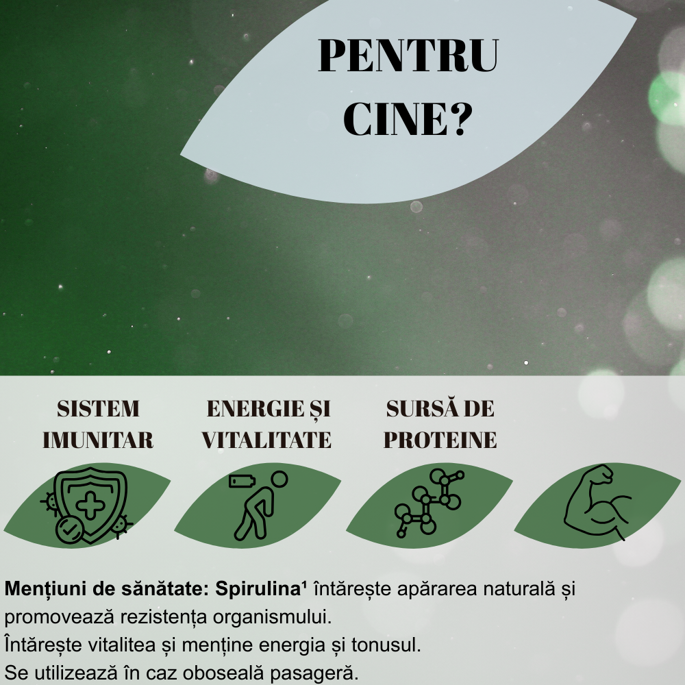 Mențiuni de sănătate: Spirulina¹ întărește apărarea naturală și promovează rezistența organismului. Întărește vitalitea și menține energia și tonusul. Se utilizează în caz oboseală pasageră.