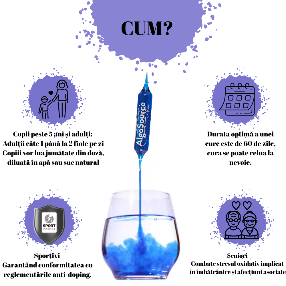 Mod de utilizare copii peste 5 ani și adulți: adulții cate 1 până la 2 fiole pe zi, copiii vor lua jumătate din doză, diluată în apă sau suc natural, durata optimă a unei cure este de 60 de zile, cura se poate relua la nevoie.