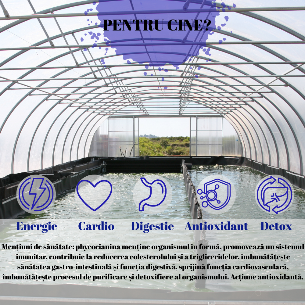 Mențiuni de sănătate: phycocianina menține organismul în formă, promovează un sistem imunitar, contribuie la reducerea colesterolului și a trigliceridelor, îmbunătățește sănătatea gastro-intestinală și funcția digestivă, sprijină funcția cardiovasculară, îmbunătățește procesul de purificare și detoxifiere al organismului. Acțiune antioxidantă.