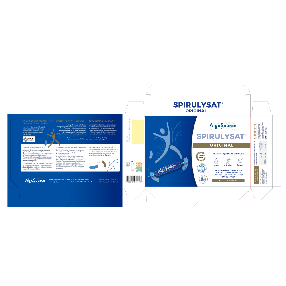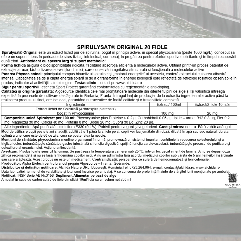 Spirulysat® Original este un extract lichid pur de spirulină, bogat în principii active, în special phycocianină (peste 1000 mg/L), conceput să ofere un suport intens în perioade de stres fizic și intelectual, surmenaj, în pregătirea pentru eforturi sportive solicitante și în timpul recuperării după efort. Antioxidant cu spectru larg și suport metabolic!