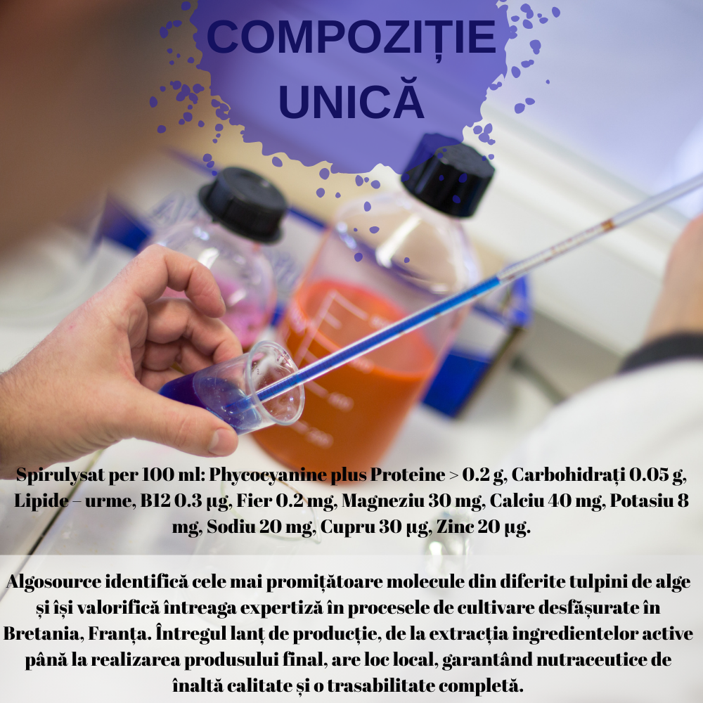 Puterea Phycocianinei: principalul compus bioactiv al spirulinei și „motorul energetic” al acesteia, conferă extractului culoarea albastră intensă. Capacitatea sa de a capta energia solară și de a o transforma în energie biologică este reflectată de reflexele roșiatice observabile în produs, indicator al activității sale biologice.
