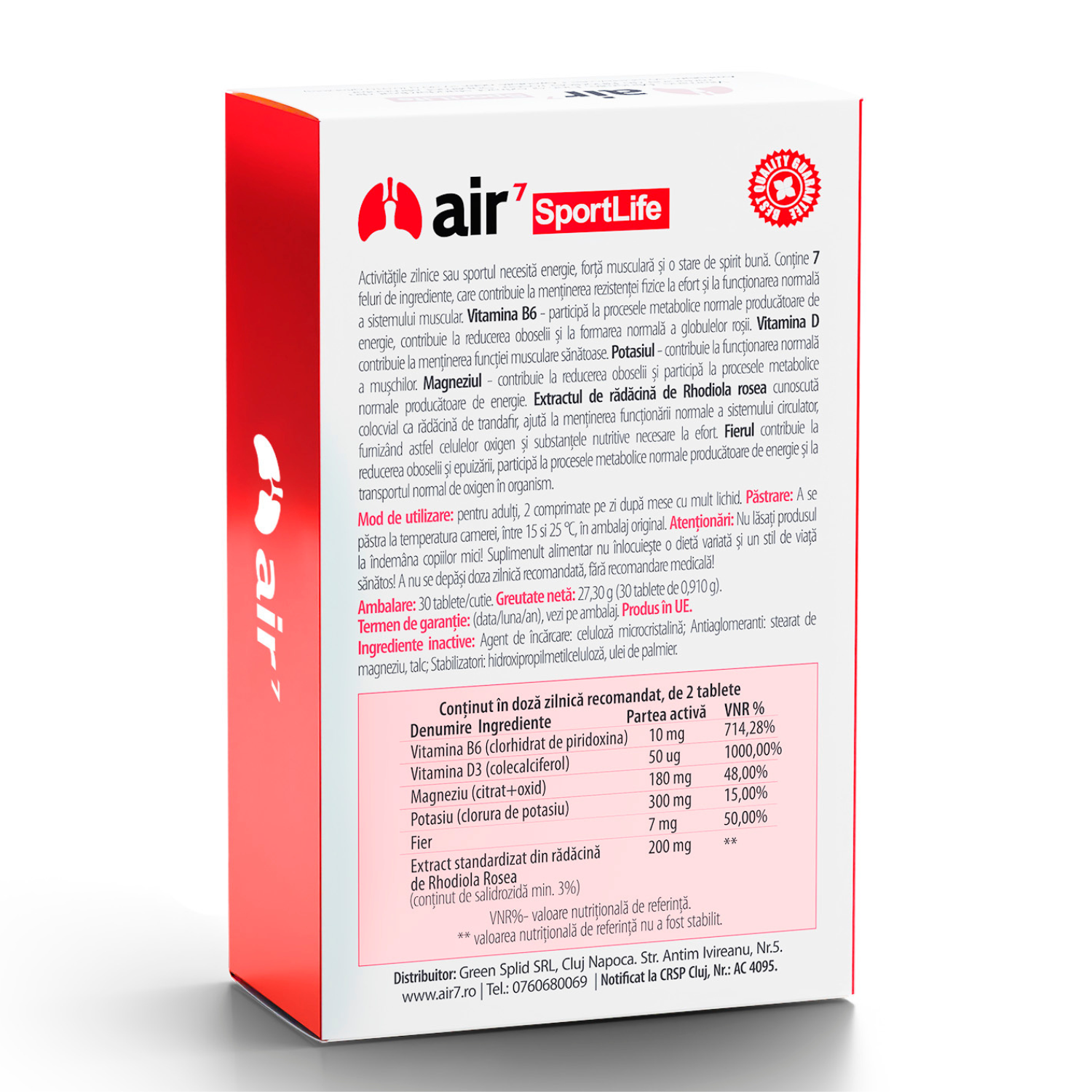 Air7 SportLife este un supliment alimentar destinat persoanelor active, formulat pentru a sprijini organismul în perioadele de efort fizic sau intelectual crescut. Conține un complex echilibrat de vitamine, minerale și extract de Rhodiola rosea, care contribuie la reducerea oboselii, menținerea performanței fizice și cognitive, echilibrul electrolitic și susținerea stării generale de bine.