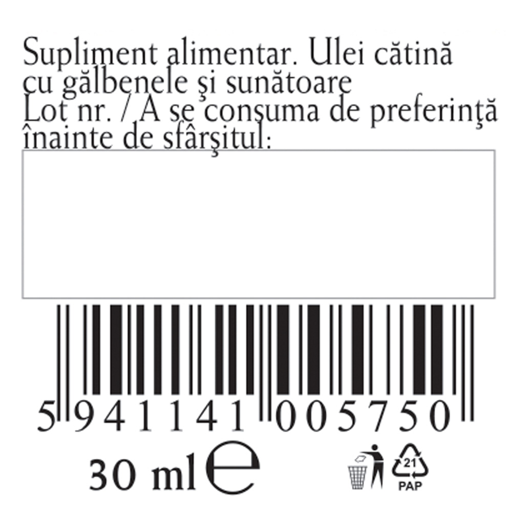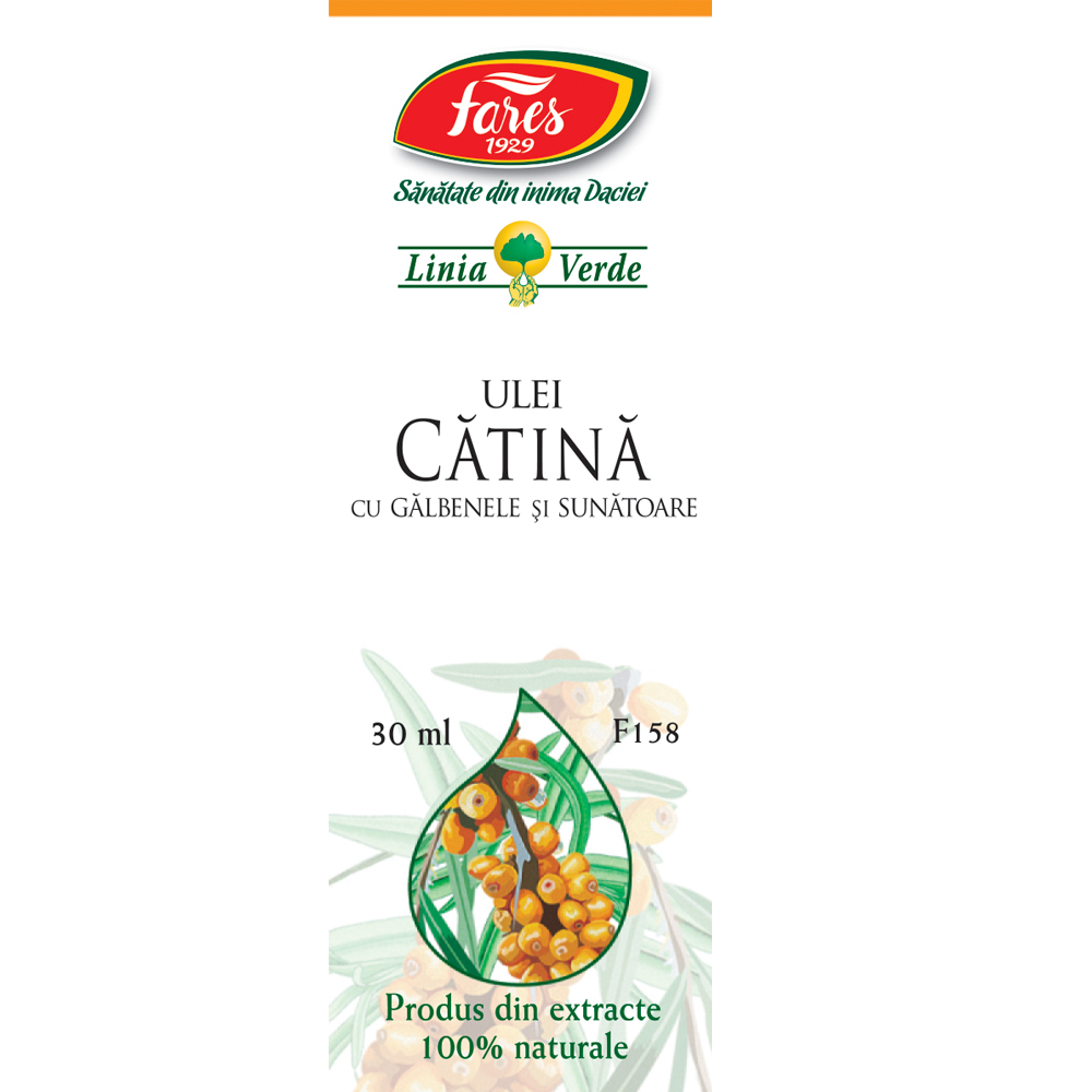 Uleiul de cătină cu gălbenele și sunătoare de la Fares este un supliment alimentar pe bază de extracte vegetale, conceput pentru a sprijini menținerea sănătății pielii și a mucoaselor, contribuind la echilibrul și rezistența naturală a organismului.