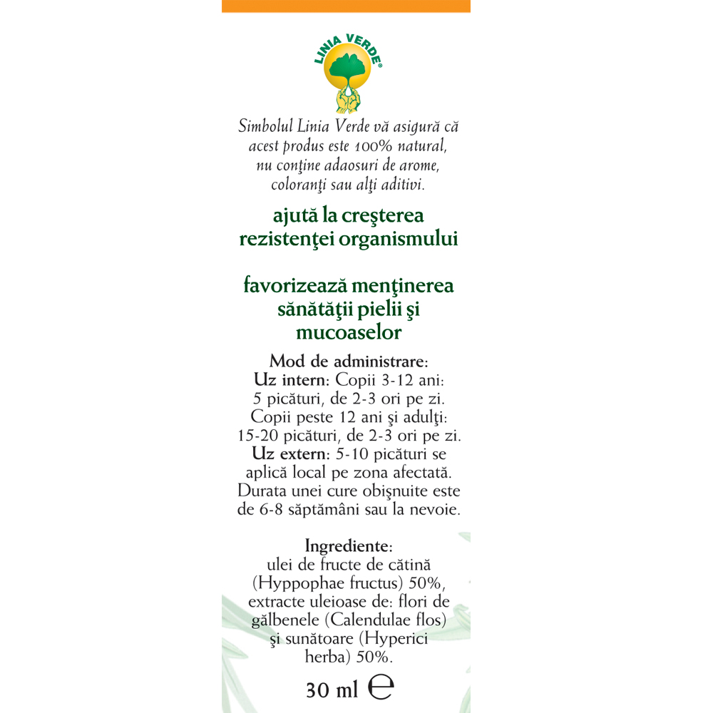 ulei de fructe de cătină (Hippophae fructus) 50%, extracte uleioase de flori de gălbenele (Calendulae flos) și sunătoare (Hyperici herba) 50%