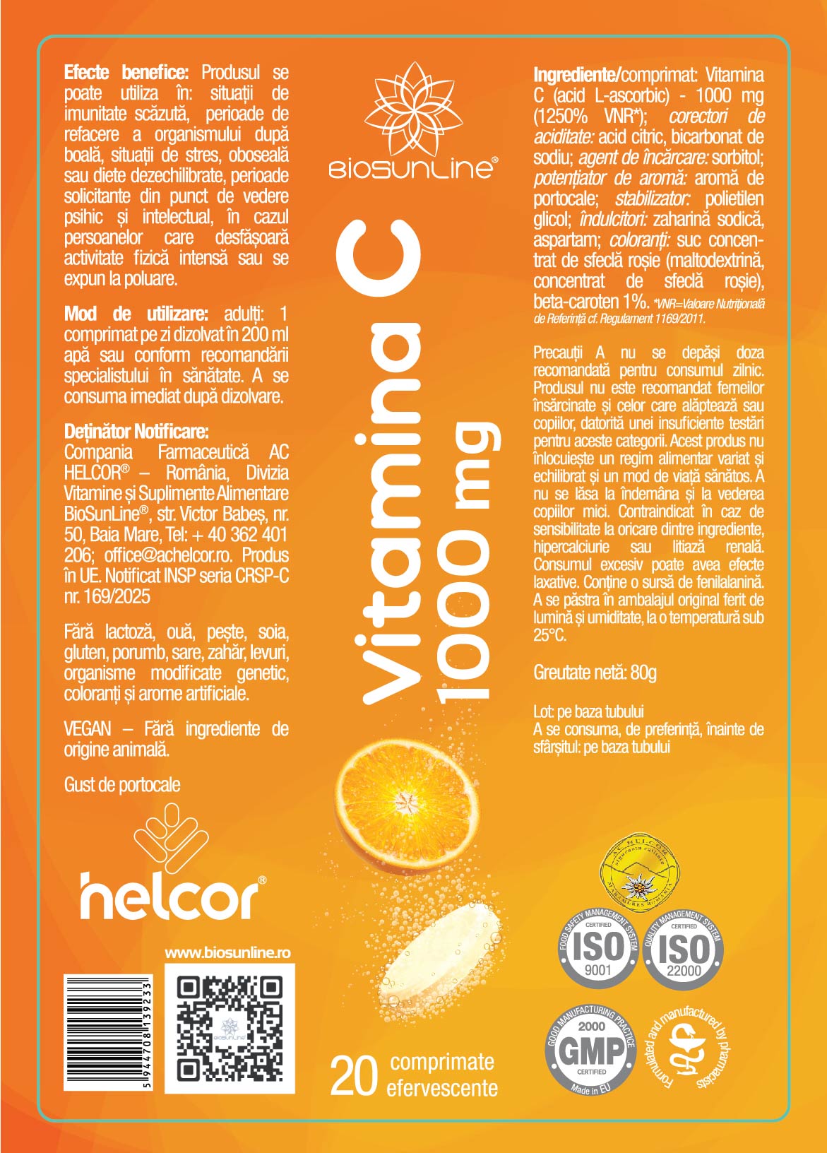 Vitamina C (acid L-ascorbic) - 1000 mg (1250% VNR*); corectori de aciditate: acid citric, bicarbonat de sodiu; agent de încărcare: sorbitol; potențiator de aromă: aromă de portocale; stabilizator: polietilen glicol; îndulcitori: zaharină sodică, aspartam; coloranți: suc concentrat de sfeclă roșie (maltodextrină, concentrat de sfeclă roșie), beta-caroten 1%.*VNR=Valoare Nutrițională de Referință cf. Regulament 1169/2011.