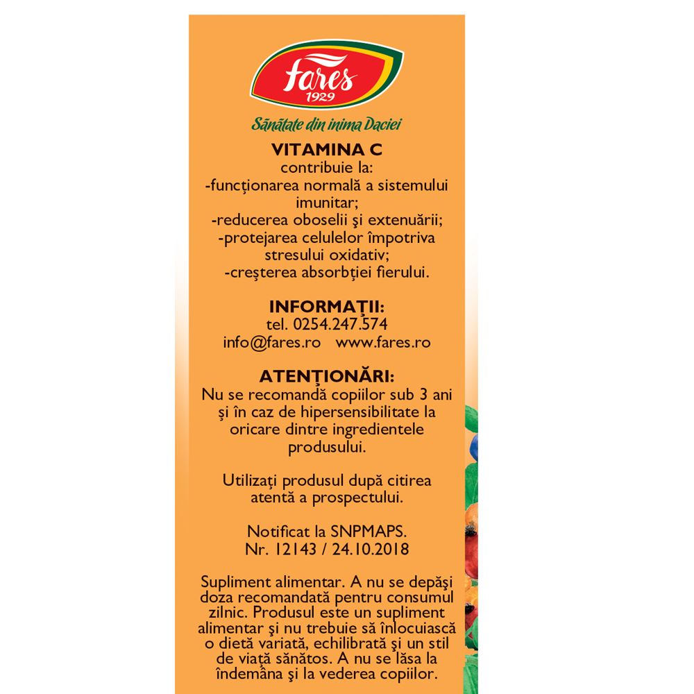 Suplimentul alimentar Vitamina C 500 de la Fares 1929 este un produs solubil, natural, cu extracte de fructe bogate în vitamina C, precum acerola, coacăze negre și cătină. Este o formulă concepută pentru a contribui la funcționarea normală a sistemului imunitar.