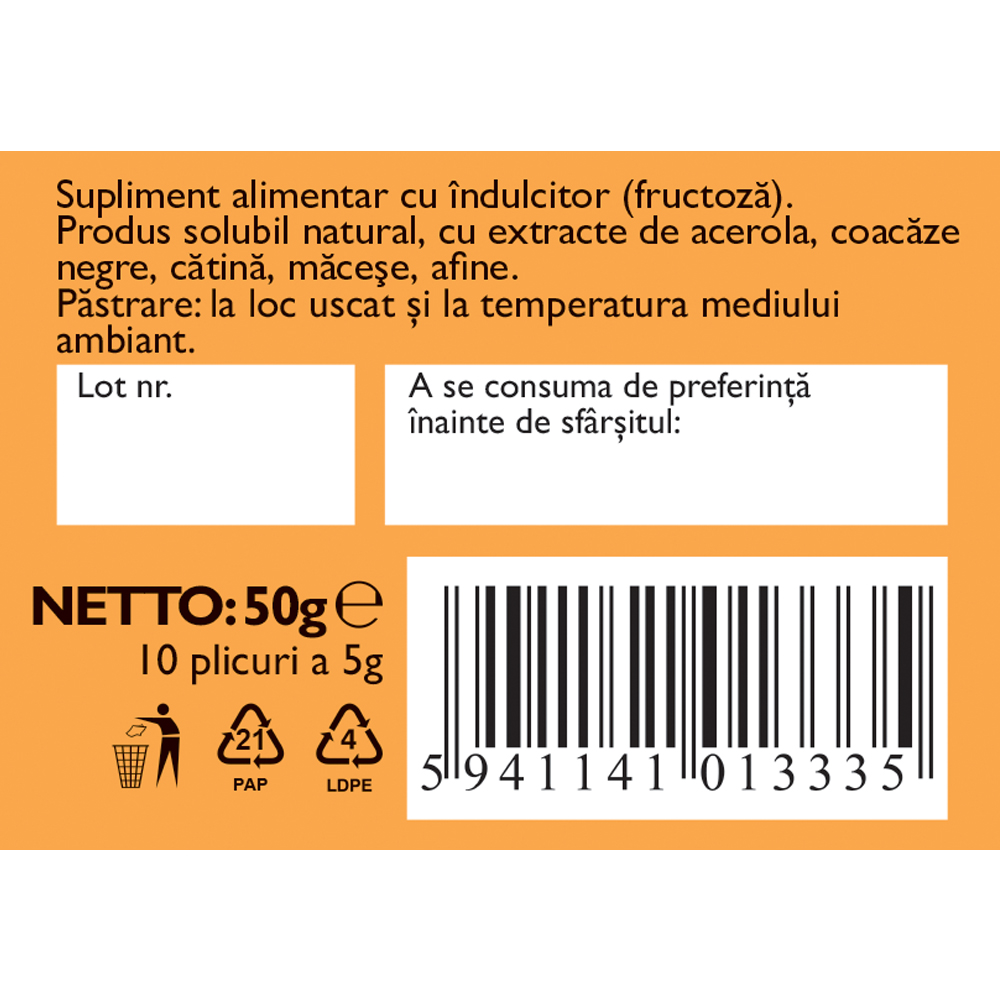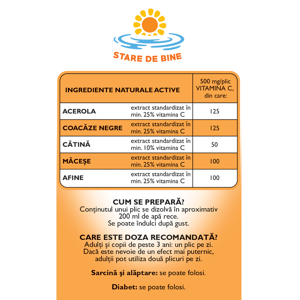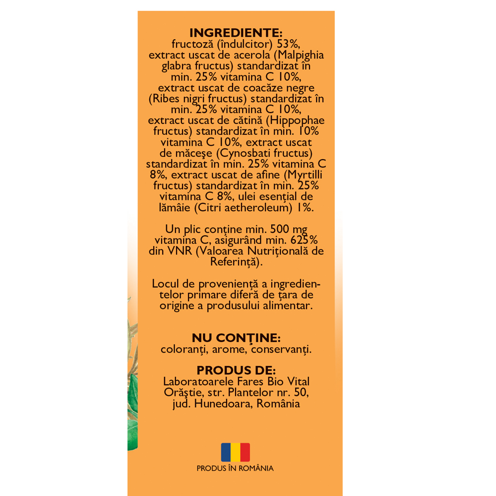 Produsul este 100% natural și nu conține coloranți, arome sau conservanți. Un plic conține minimum 500 mg de vitamina C, asigurând minimum 625% din Valoarea Nutrițională de Referință.