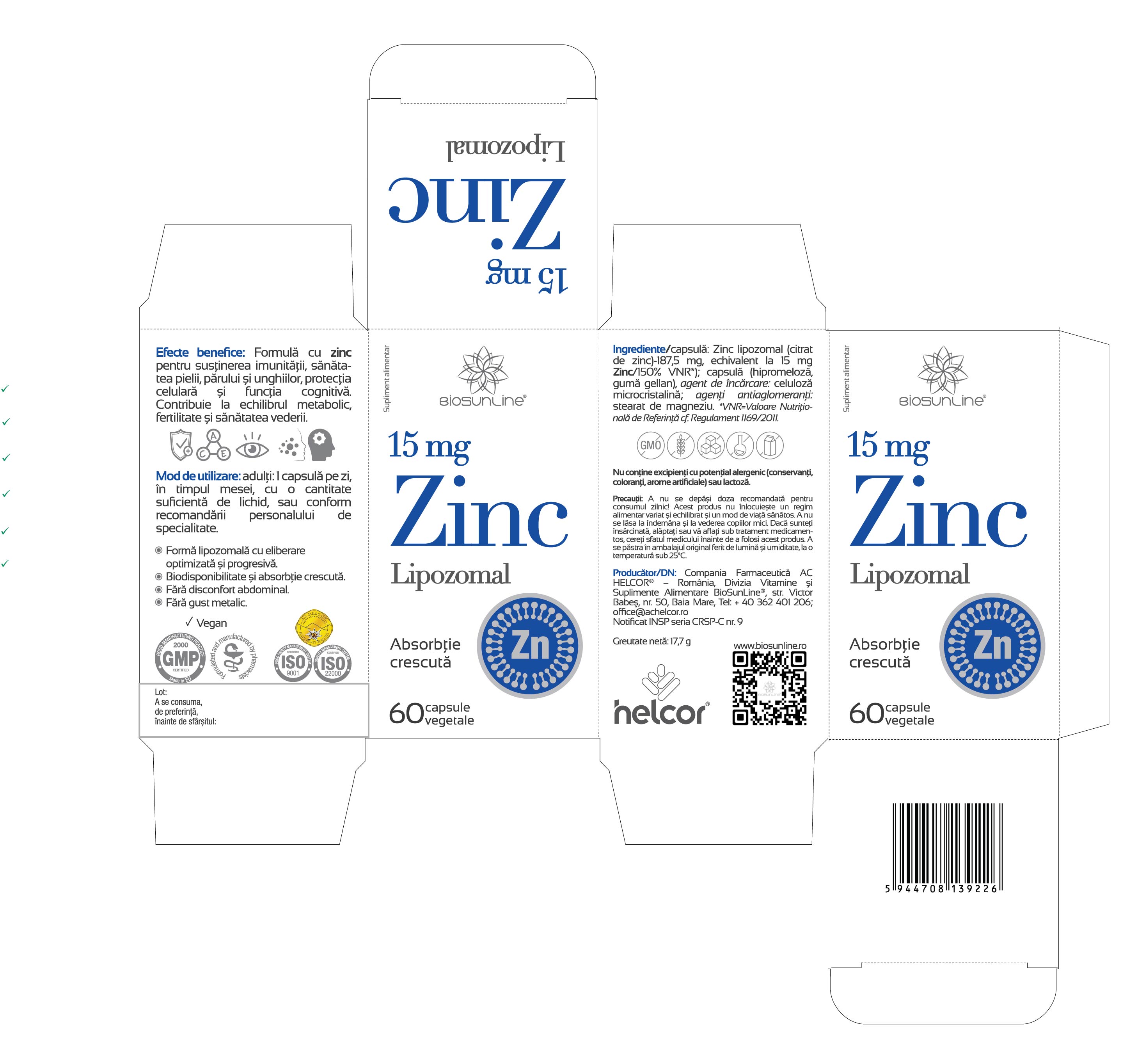 Zinc lipozomal (citrat de zinc)-187,5 mg, echivalent la 15 mg Zinc/150% VNR capsulă (hipromeloză, gumă gellan), agent de încărcare: celuloză microcristalină; agenţi antiaglomeranţi: stearat de magneziu.*VNR=Valoare Nutriţională de Referinţă cf.Regulament 1169/2011)