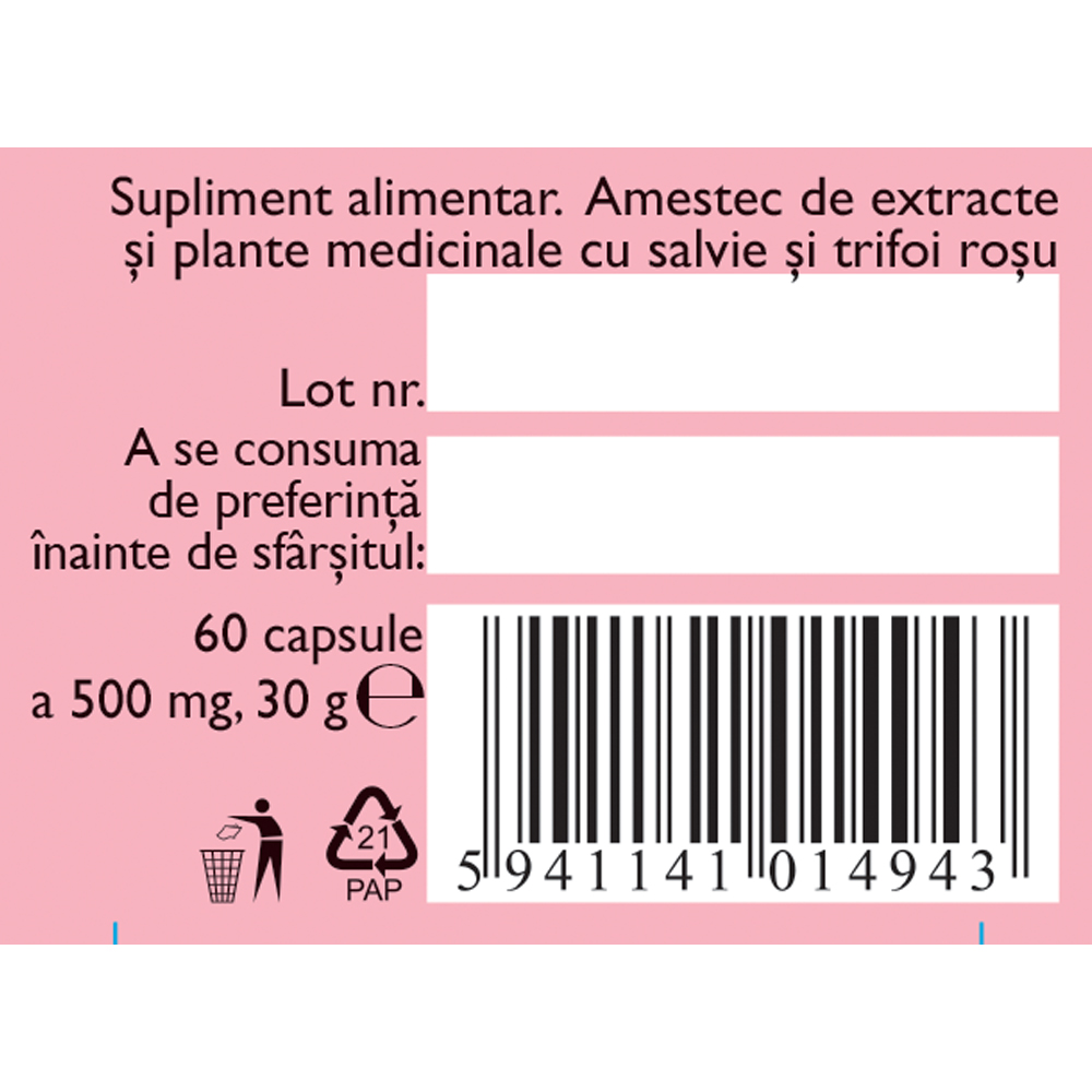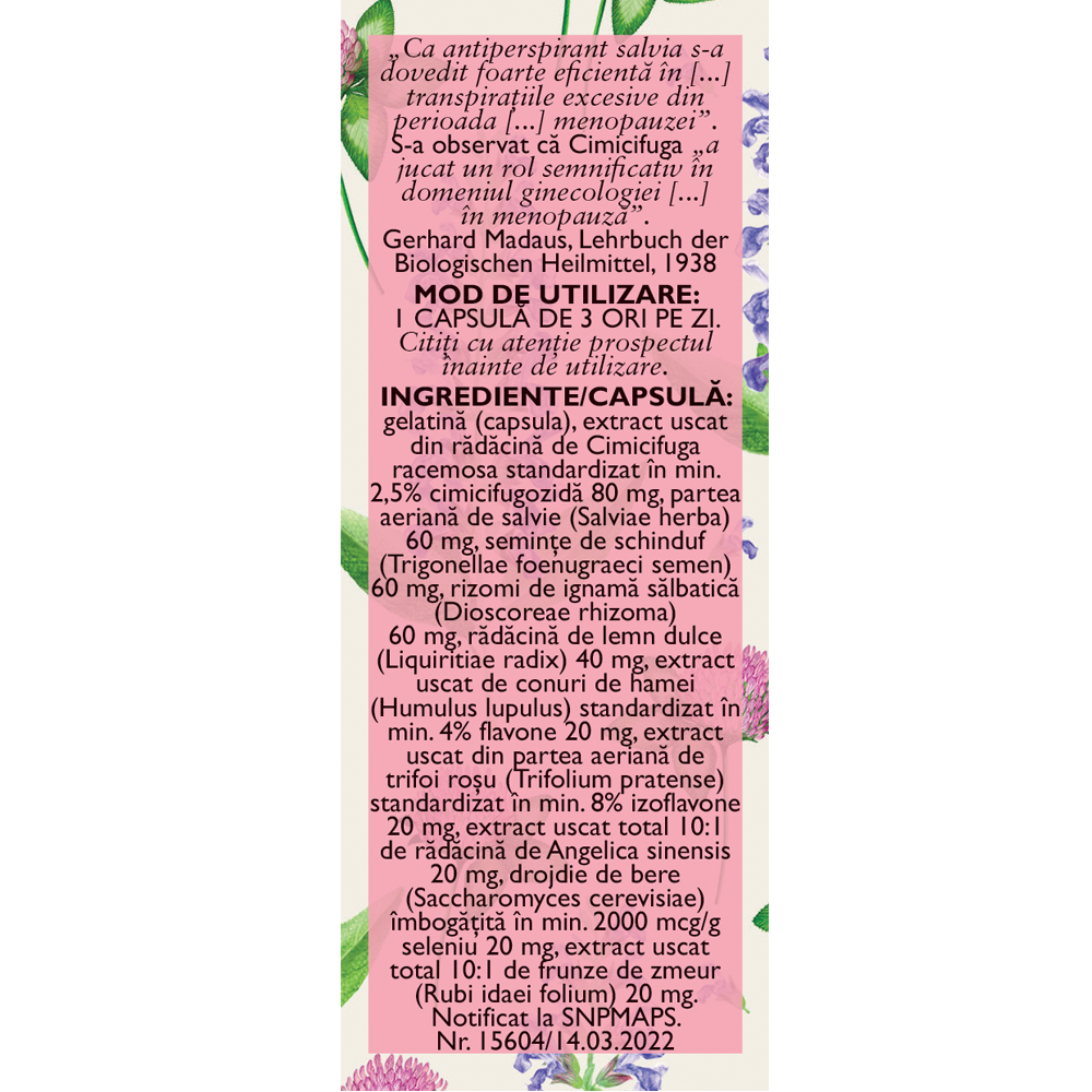 Angelica sinensis, Cimicifunga racemosa, Lemnul dulce, Salvie, Talpa gastei, Trifoiul rosu.