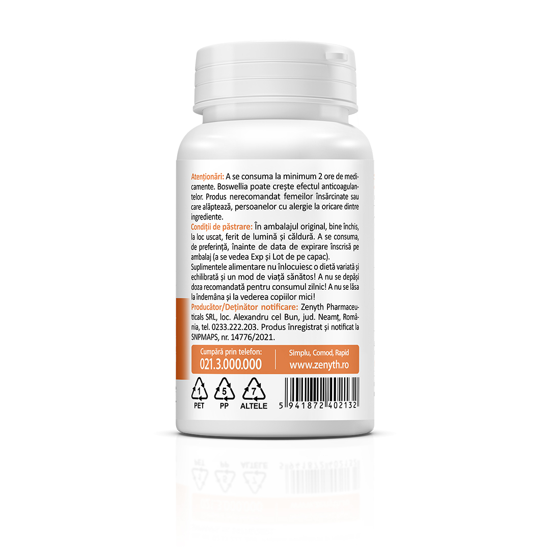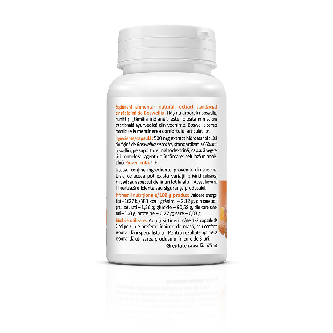 500 mg extract hidroetanolic 10:1 din rășină de boswellia serrata, standardizat la 65% acizi boswellici, pe suport de maltodextrină; capsulă vegetală: hipromeloză; agent de încărcare: celuloză microcristalină.