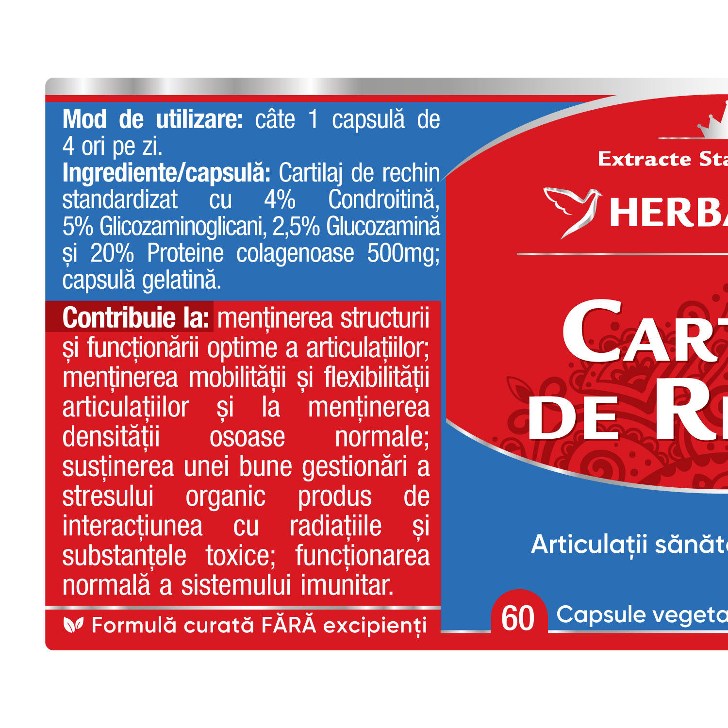 per/capsulă: Cartilaj de rechin standardizat cu 4% Condroitină, 5% Glicozaminoglicani, 2,5% Glucozamină și 20% Proteine colagenoase 500mg; capsulă gelatină.