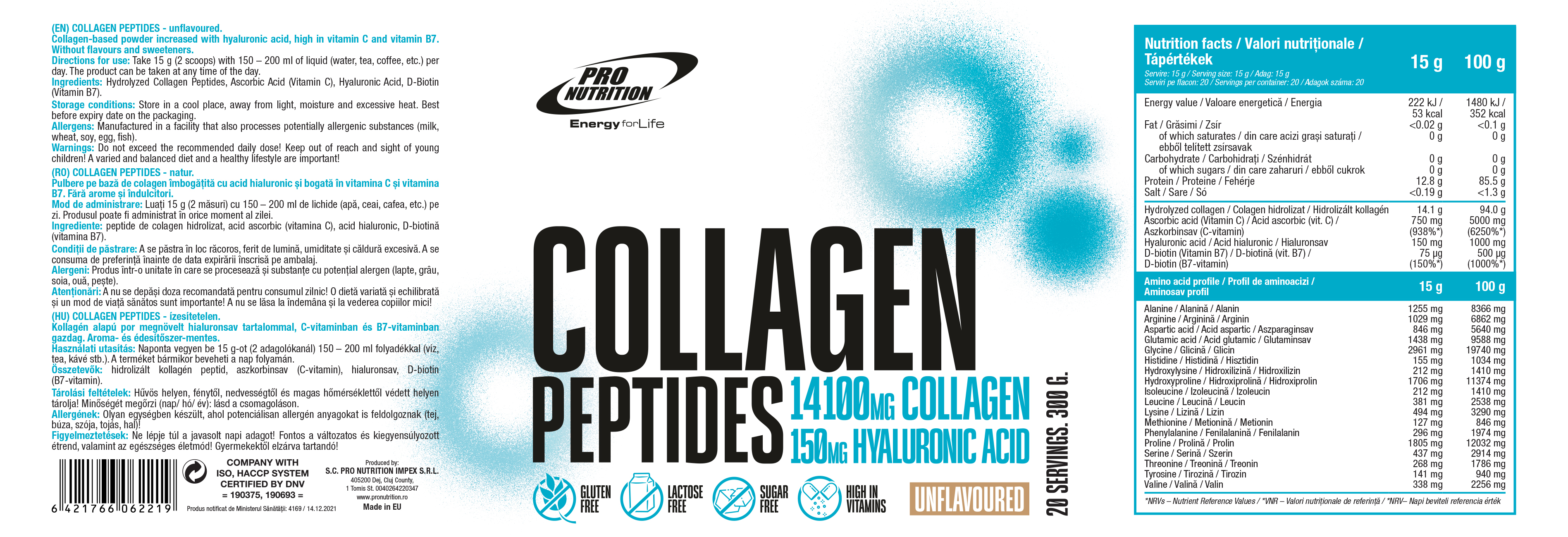 Acest supliment nutritiv conține peptide de colagen de origine bovină, cu peste 85% proteine (12,8 g per porția de 15 g) cu valoare biologică înaltă. Este îmbogățit cu acid hialuronic, vitamina C și biotină.