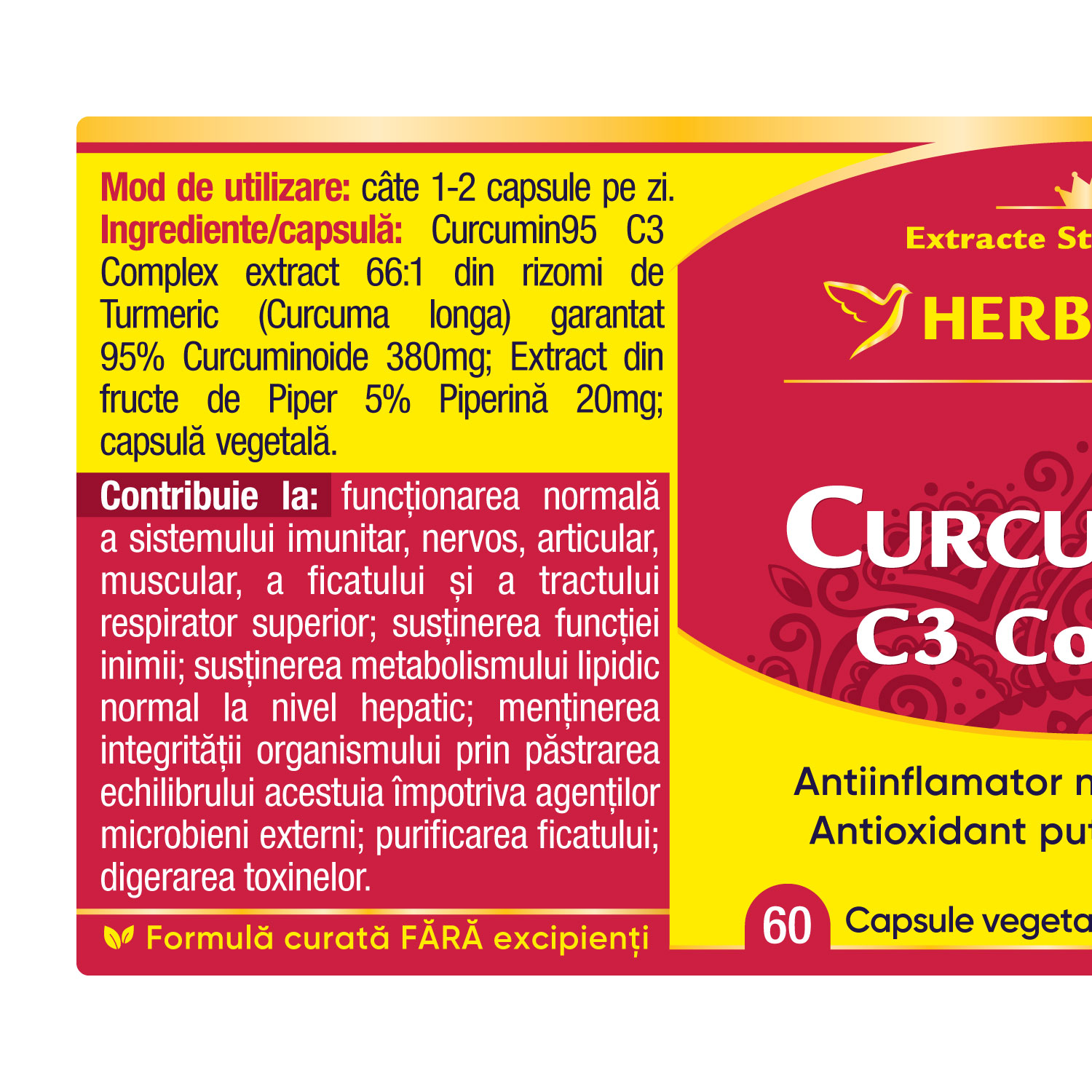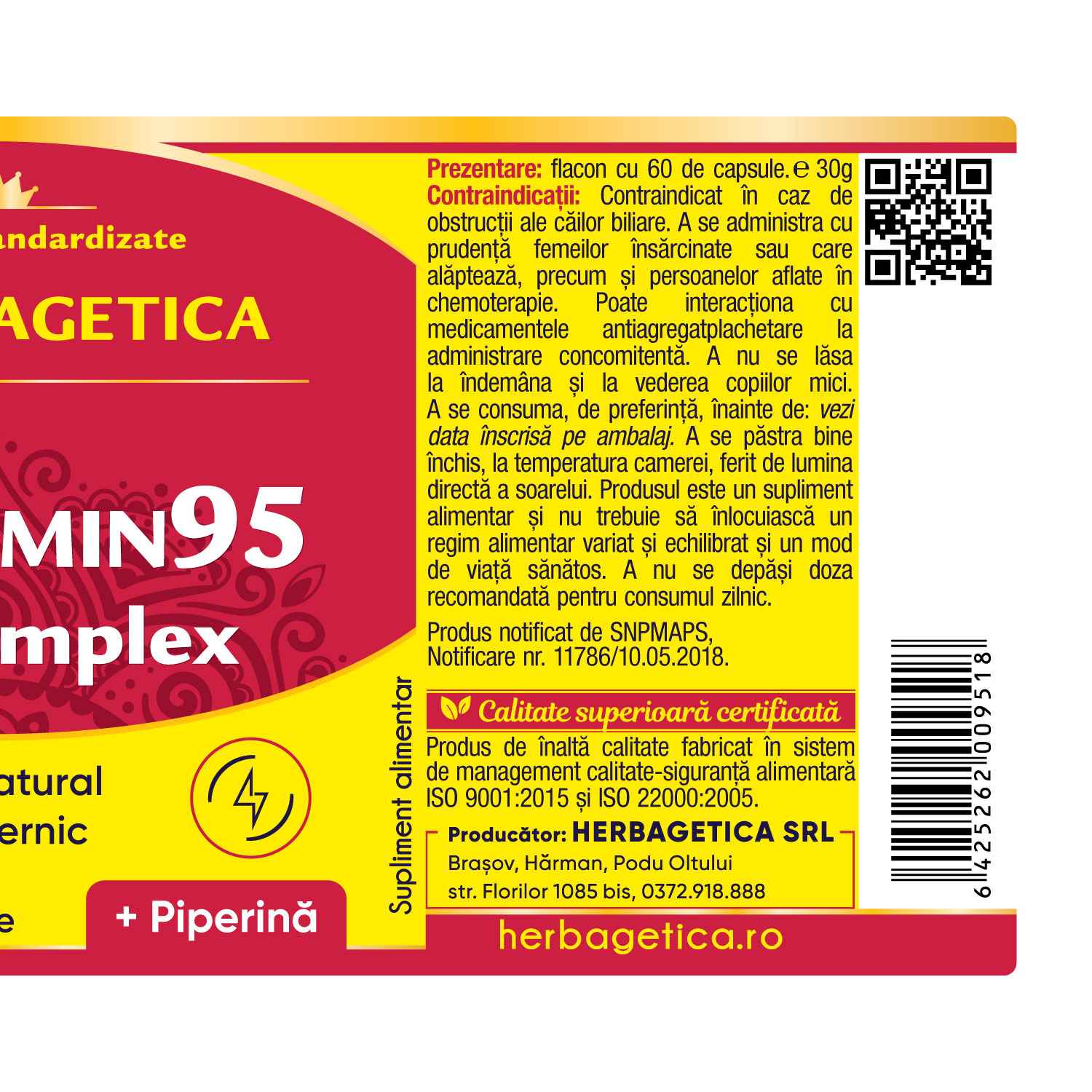 Ingrediente/capsulă: Curcumin95 C3 Complex extract 66:1 din rizomi de Turmeric (Curcuma longa) garantat 95% Curcuminoide 380 mg; Extract din fructe de Piper 5% Piperină 20 mg; capsulă vegetală.