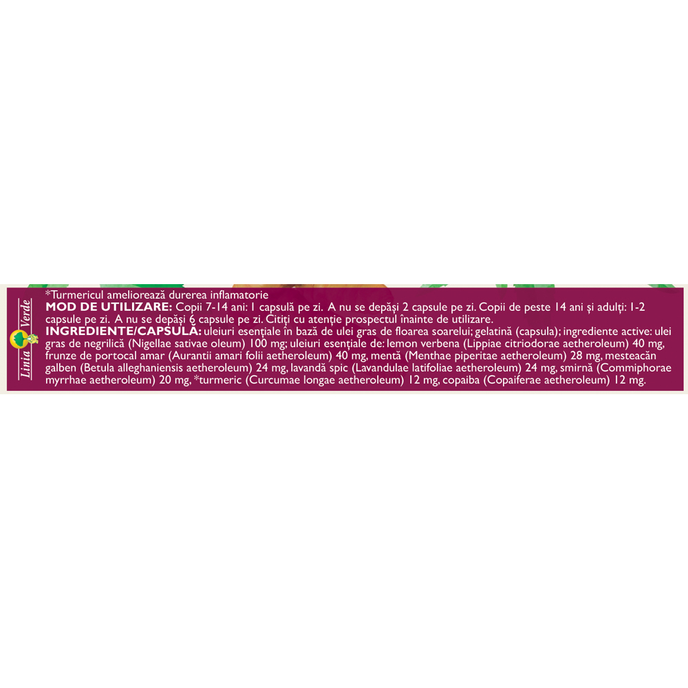uleiuri esențiale în bază de ulei gras de floarea soarelui, gelatină (capsula); ingrediente active: ulei gras de negrilică (Nigellae sativae oleum) 100 mg, ulei esențial de lemon verbena (Lippiae citriodorae aetheroleum) 40 mg, frunze de portocal amar (Aurantii amari folii aetheroleum) 40 mg, mentă (Menthae piperitae aetheroleum) 28 mg, mesteacăn galben (Betula alleghaniensis aetheroleum) 24 mg, lavandă spic (Lavandulae latifoliae aetheroleum) 24 mg, smirnă (Commiphorae myrrhae aetheroleum) 20 mg, turmeric (Curcumae longae aetheroleum) 12 mg, copaiba (Copaiferae aetheroleum) 12 mg.