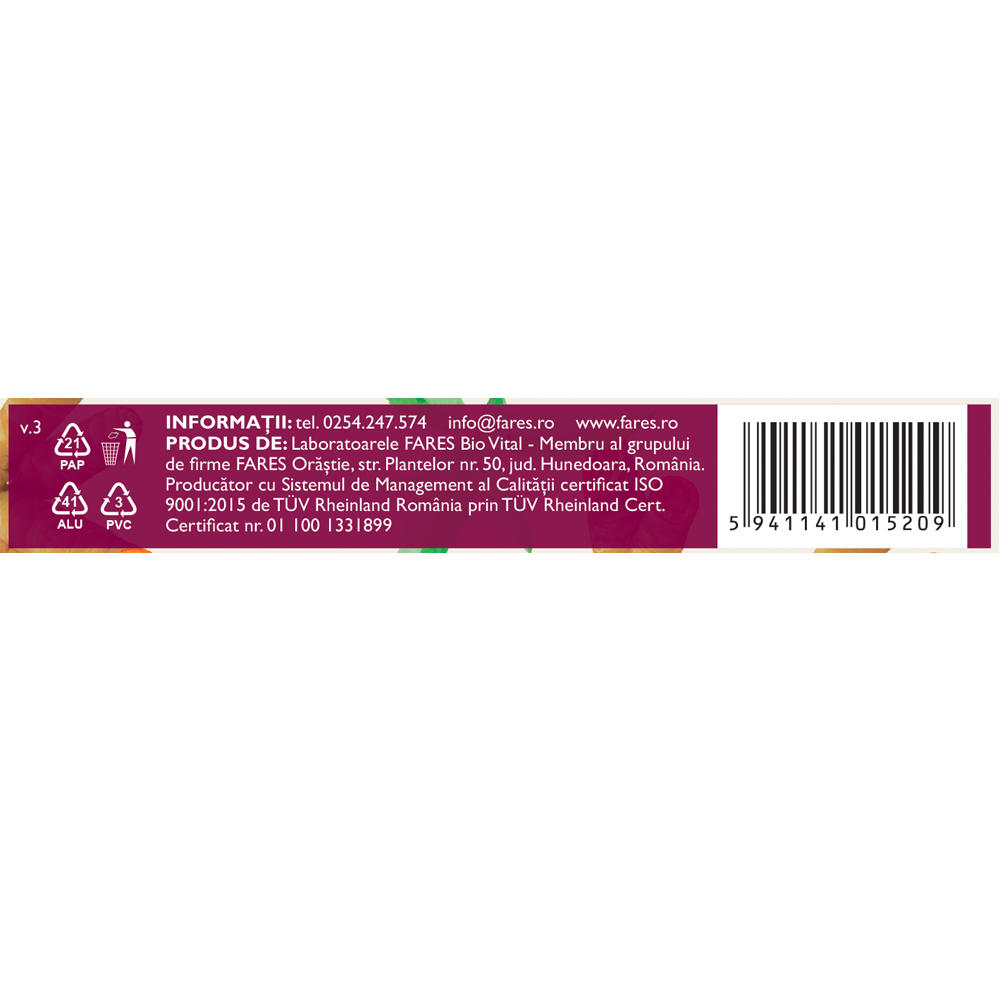 A nu se depăși doza recomandată pentru consumul zilnic. Produsul este un supliment alimentar și nu trebuie să înlocuiască o dietă variată, echilibrată și un stil de viață sănătos. A se păstra la loc uscat, la temperatura mediului ambiant și a nu se lăsa la îndemâna și la vederea copiilor mici.