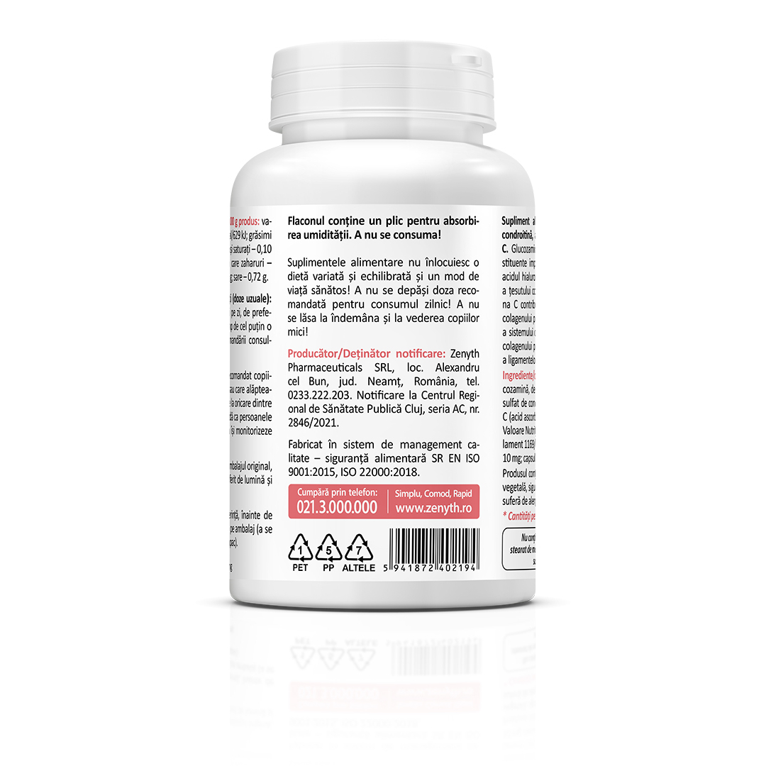 Supliment alimentar cu glucozamină, condroitină, acid hialuronic și vitamina C, destinat completării aportului zilnic de nutrienți implicați în structura țesuturilor conjunctive.