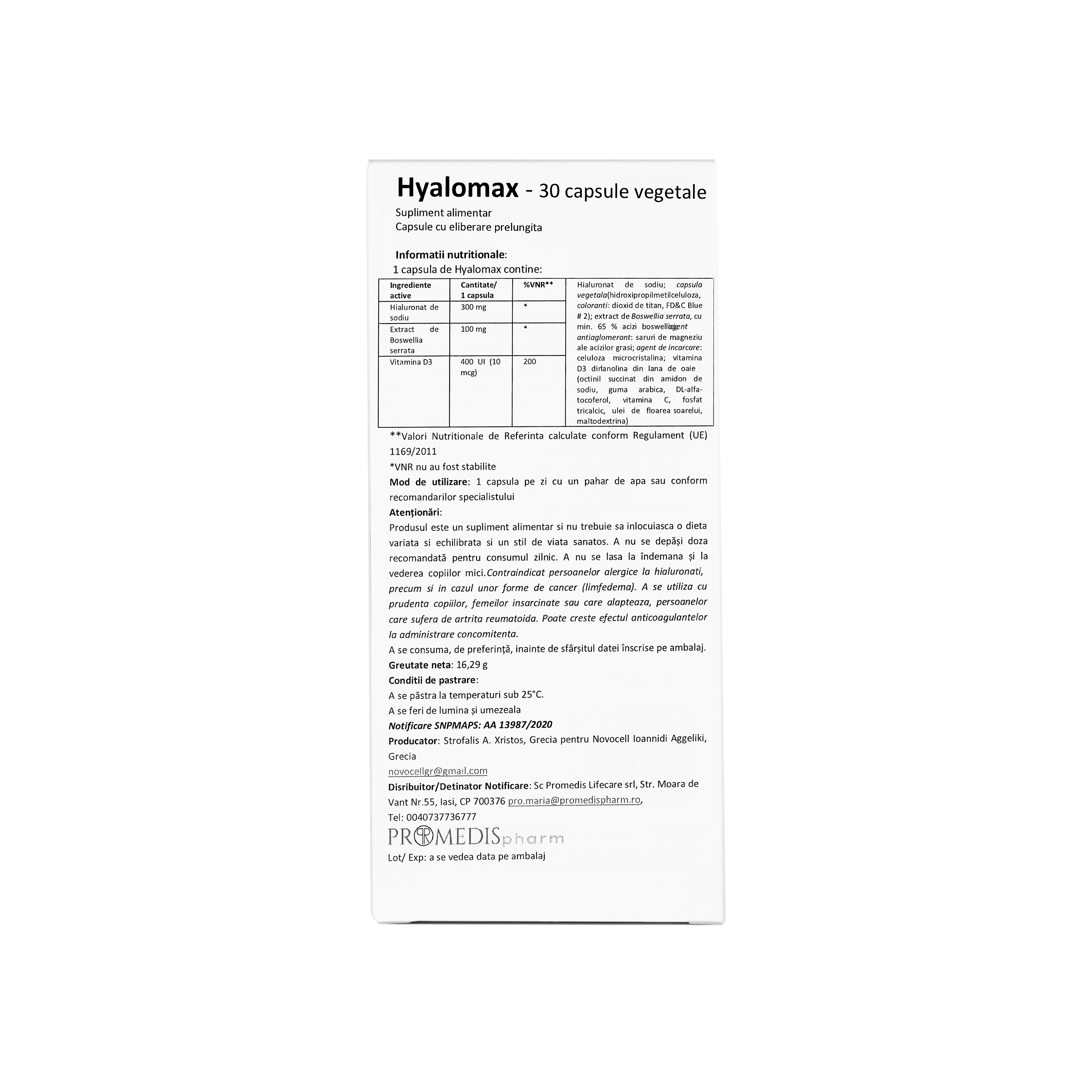 Hyalomax 300 mg este un supliment alimentar ce susține sănătatea articulațiilor printr-o combinație unică de acid hialuronic cu greutate moleculară mare, extract de Boswellia serrata și vitamina D3. Formula sa avansată contribuie la reducerea disconfortului articular, menținerea elasticitatii și flexibilitatii articulațiilor.