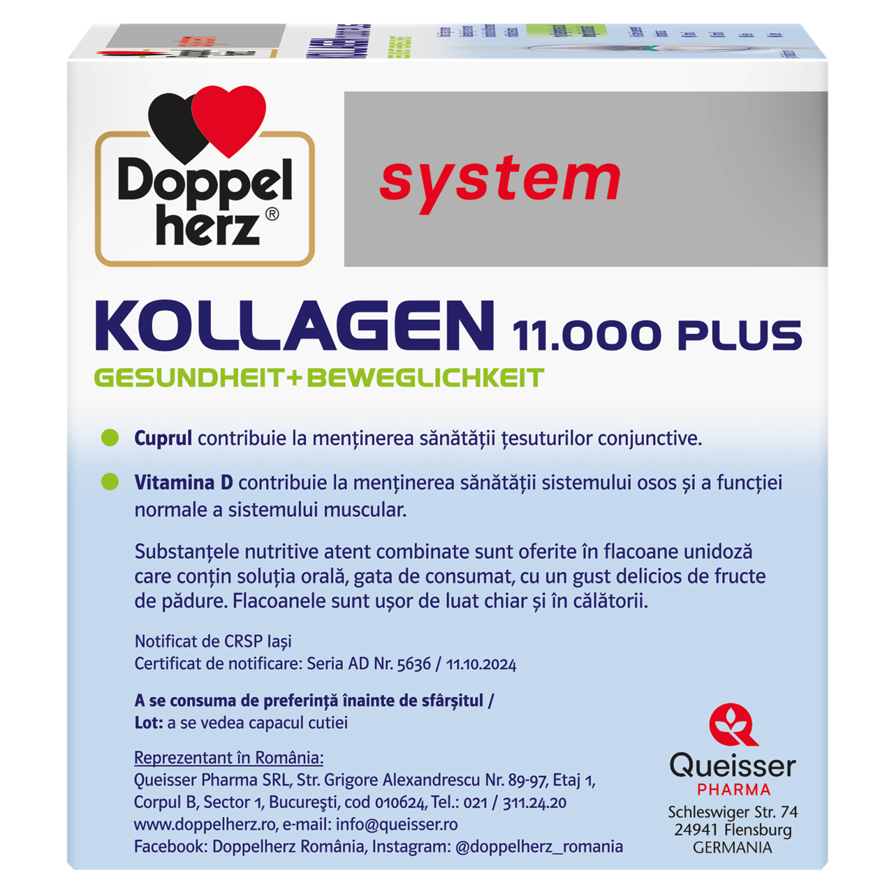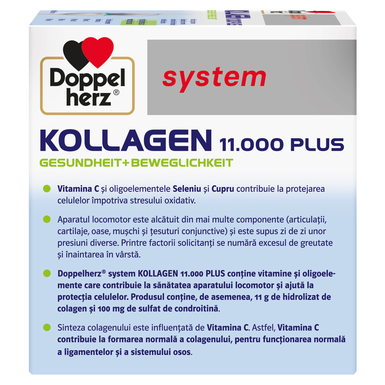 Parte din gama Doppelherz® pentru sistemul osos și articulații, Doppelherz® system Kollagen 11.000 Plus conține nutrienți care contribuie la sănătatea aparatului locomotor și ajută la protecția celulelor. În plus, substanțele nutritive atent combinate sunt oferite în flacoane unidoză care conțin soluția orală gata de consumat, cu un gust delicios de fructe de pădure. Astfel, flacoanele sunt ușor de luat chiar și în călătorii.