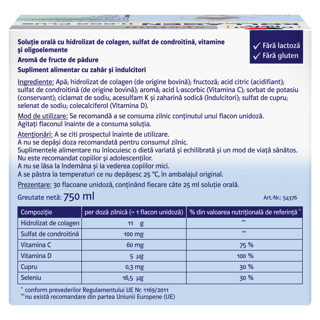 Un flacon unidoză cu 25 ml soluție orală conține: Apă, hidrolizat de colagen (de origine bovină) 44%, fructoză (îndulcitor), acid citric (corector de aciditate), sulfat de condroitină (de origine bovină) 0,4%, acid L-ascorbic (Vitamina C), sorbat de potasiu (conservant), aromă, ciclamat de sodiu, acesulfam de potasiu și zaharină sodică (îndulcitori), sulfat de cupru, selenat de sodiu, colecalciferol (Vitamina D).